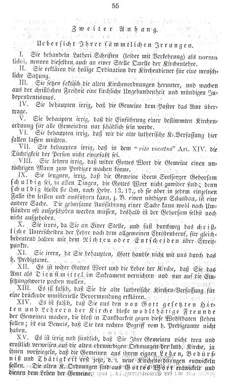 Freystatt, Town Nine, August 5, 1844 After receiving the critique of the beloved brothers in office, the reverend pastors of Missouri, and the pastoral letter of beloved Pastor Grabau and comparing the critique with God's word, the symbolic books and Dr. Luther's writings as well as the old true proofs of the Lutheran church, and holding it up to the content of the pastoral letter, I can give my most complete agreement concerning the at-hand anti-critique of Pastor Grabaus and can declare myself totally of one mind with this, his anti-critique and at the same time wish with him, that this as well as all offered debates and instructions by the ministerial brothers in Missouri may produce a nonsectarian reconsideration and a renunciation of their unlutheran point of view. May God dispose! Lff. Krause, Ev. Luth. Pastor Kirchhayn, Town Ten, August 21, 1844 As much as my heart would have peace in the church of God and particularly within the doctrinal profession, for the sake of peace I cannot forget the truth. Since I find pure truth humbly and discreetly expressed in the anti-critique of Pastor Grabau, I heartily agree with it and hope that it may be as instructive to others as it was to me. Kindermann, Ev. Luth. Pastor A Letter from Pastor Grabau to Pastor Brohm in New York Enclosed with the Refutation Buffalo, June 26, 1844 Beloved Brother in Office! I thank you for your kind response of May 30th. You think ill of me that I have not yet sent you the Missouri critique of my pastoral letter. Despite my best intentions this was impossible for me and I bear the guilt in so far as I |