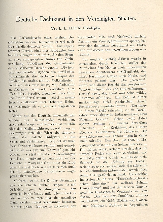 by L. L. Leser, Philadephia The existence of a rich emotional life among the Germans is even older than German culture. It is our custom to treat as sacred those most mythical days before the time of recorded history, for they carry a sublimated remembrance and ennoblement of the events in human existence. The brash and wondrous myths of the nordic heaven, the lowlands sagas, the ancient and meaningful fairytales, and above all else eternally young, fully melodious folksongs bear witness to the Germanic tendency to elevate and refine primative experience to a form beyond the mundane. The German may have remained within the borders of his homeland or he may have ventured forth across the globe but he has always carried the legacy of his fathers — the German disposition and German fervour — to all zones and all situations. How often has this fervour been scorned and ridiculed to the point where is has become rebuke — this fervour has been maintained despite all hostile attitudes since the German remains a child of his homeland in word and sentiment, strongly attuned to the circumstances surrounding him. Wherever Germanic children directed their footsteps, they carried with them a piece of the Nibelung treasure, which is called German poetry. Thus it is no wonder that the mighty land, first approached by the Normans and finally discovered by the great man from Genoa almost a quarter of a century later,could grant a small place to German poetry in the new world. Approximately 60 years ago the correspondence of an unknown German adventurer was published in Amsterdam by Friedrich Müller. This man went to Mexico and Yucatan with Ferdinand Cortez. The report described the "New Age" of wanderlust and Cortez' enterprises as well as the land and its wild inhabitants. This remarkable letter was written around 1520 and its closing words go something like this: "This letter is written by one in the company of a knight who has traveled to India named Fernand Cortez." Twelve years later a second such report appeared — the story of Ulmer Nicolaus Federmann the Younger in which is communicated his adventures and experiences in Venezuela. The book was printed in Hagenau in 1536 and was received with much interest.