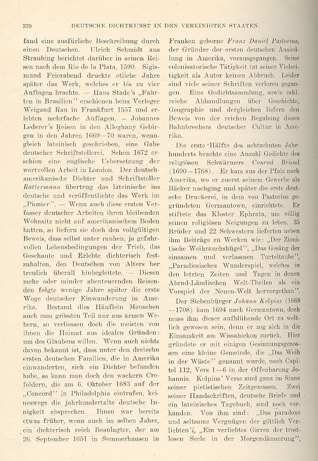 was widely detailed by a German. Ulrich Schmidt of Straubing discussed his journey to Rio de la Plata in 1590. A few years later Sigismund Feierabend printed the work, which went through four editions. — Hans Stade's "Travels in Brazil" was published by Weigand Rau in Frankfurt in 1557 and it went through several republishings. Johannes Leder's travels in the Allegheny Mountains in 1669 - 1670, although written in Latin, was a gift of German authorship. By 1672 an English translation of this worthy opus was published in London. The German-American poet and writer Ratterman translated the Latin into German and published the work in The Pioneer. Even if these first compilers of German works didn't reside on American soil, they still delivered valid proofs that even under raw and even dangerous circumstances, the impetus is still present to poetically interpret experience and this is truly characteristic of all Germans from the past to the present.