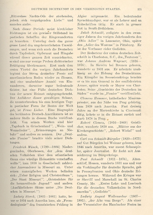 After this period of mostly religious poetry there is a marked cessation in poetic production by immigrants. This may be attributed to colossal upheavals throughout the entire country and although the Germans of the period were distinguished by their bravery, their willingness to make sacrifices and their devotion, few examples of poetic activity have come down to us. The stream of German poetry began once more to flow in American soil after the first quarter of the Nineteenth Century and an unfathomable number of immigrants, among them many significant intellects, brought the plenum of German verse to the new homeland. The foremost leader of this mighty army, which gave its best in poetic form to the world in unbroken lineage up to today, is Franz Lieber. A full biography of this famous German-American is published in another section of this book. Among his works are "Journal in Greece," "Songs of Wine and Rapture," "Remembrances of Niebuhr," etc. The Deutsche Pionier has published many of his compositions. Friedrich Münch (1799 - 1884) from Niedergemünden, Oberhessen, "wanted to have a worthy homestead for German folklife across the Atlantic Ocean." In 1838 he arrived in Missouri in the company of numerous immigrants. Among his diverse works we find "On Religion and Christendom," "The State of Missouri," "Spiritual Instruction for the Maturing Youth," etc. (A more complete sketch can be found in the chapter "The Germans in Missouri.") Ludwig Storck (1803 - 1883) was a member of the French Foreign Legion in Algiers before coming to America in 1834. He was an important linguist, who was a teacher and wrote articles for various periodicals. He died in great poverty in South Bethlehem. Jakob Schmidt edited the Ohio Adler in Lancaster, Ohio in the 1820s. Later he edited the Adler des Westens in Pittsburg. He is the writer of many poems. Johann Andreas Wagoner (1816 - 1876) was the editor of the first German periodical in Charleston, South Carolina, called the Teutonen. Born in Sievern near Bremen, he emigrated in 1831. He worked ceaselessly for the elevation of the German people. As a soldier in the Civil War he reached the rank of general in the Confederate Army. Later he became mayor of Charleston. His "History of the Germans in the South" was published in the Pionier. Clemens Hammer, a Catholic missionary priest, was born near Prague and came to America in 1838. Active for almost 30 years at St. Mary's Church in Cincinnati, he returned to his homeland and died in Prague in 1878. Robert Clemen (1816 - 1869) was a minister, who emigrated in 1838. He wrote "Pages from the Church History," "Robert Wielaf" and other pieces. Carl von Schmidt-Bürgeler (1820 - 1875) was born on the Bürgeler Estate in Weimar and came to America in 1846. First he was an actor and then a journalist. He fought with distinction in the Civil War. Paul Schmidt (1811 - 1876) of Altenschlirf, Hessen emigrated in 1831 and was a champion of the German language, publishing German newspapers in Pennsylvania and Ohio. During the Civil War he was sheriff and marshall in St. Charles County, Missouri. He wrote A First Instruction Book and Reader for German Primary Schools in North America and Poetry. Ludwig August Wollenweber (1807 - 1881) - "The Old Man from the Mountain." As an organizer of the Hambach Festival in |