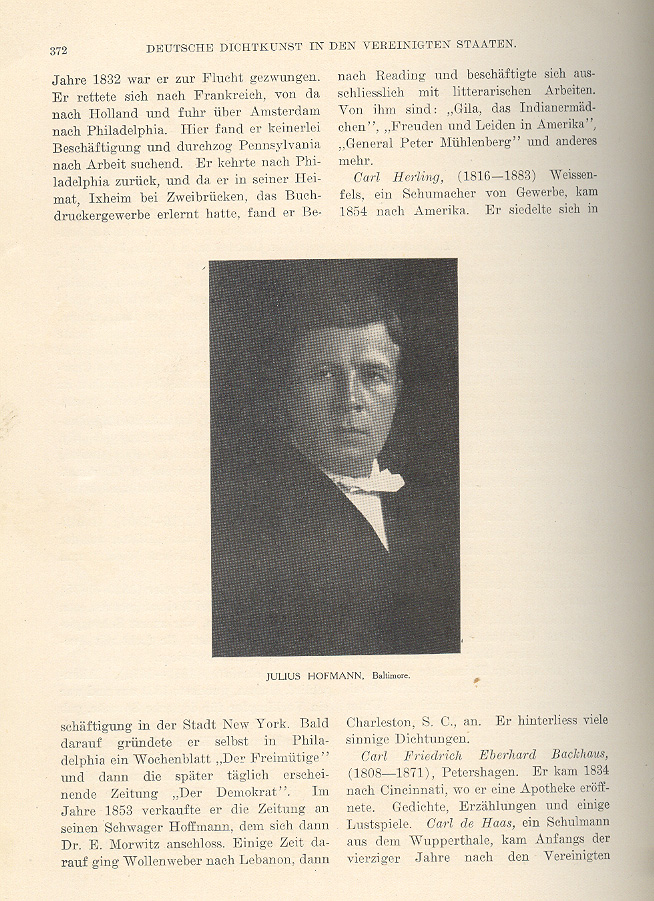 forced into exile in 1832. He escaped to France, from there he went to Holland. From Amsterdam he went to Philadelphia. Here he found no employment and he traveled through Pennsylvania looking for work. He returned to Philadelphia and then to his homeland in Ixheim near Zweibrücken, where he learned the book printers trade, then he found employment in the State of New York. Soon after he established a weekly newspaper called Der Freimütige in Philadelphia and later the daily newspaper Der Demokrat. In 1853 he sold the newspaper to his brother-in-law, Hoffman, who then joined with Dr. E. Morwitz. Sometime later Wollenweber went to Lebonon, then Reading and he occupied himself exclusively with literary works. From him we have "Gila, the Indian Maiden," "Joy and Sorrow in America," "General Peter Mühlenberg" and other works. Carl Herling (1818 - 1883) from Weissenfel was a shoemaker by trade and came to America in 1854. He settled in Charleston, South Carolina. He left behind many ponderous compositions. Carl Friedrich Eberhard Backhaus (1808 - 1871) from Petershagen. He came to Cincinnati in 1834 where he opened an apothecary shop. He wrote poetry, short stories and comedies. Carl de Haas, a teacher from the Wupperthale, came at the beginning of the 1840s to the United States. _____ Caption below picture at center reads Julius Hofmann, Baltimore. Go to Pages 372 - 377 Return to Cover, Title & Index |