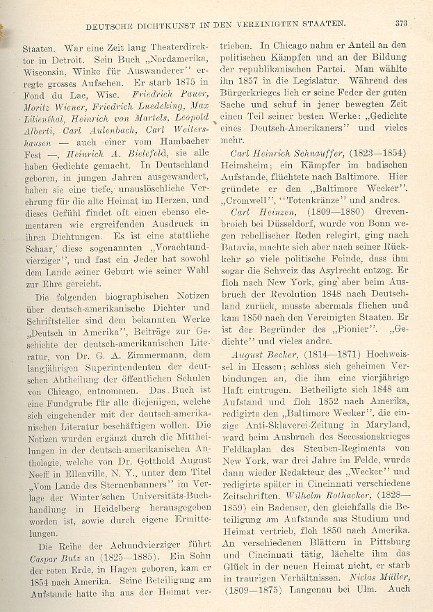 For a time he was a theater director in Detroit. His book, North America, Wisconsin, Tips for Emigrants created quite a sensation. He died in 1875 in Fond du Lac, Wisconsin. Friedrich Pauer, Moritz Wiener, Friedrich Luedeking, Max Lilienthal, Heinrich von Martels, Leopold Alberti, Carl Aulenbach, Carl Weitershausen — and another from the Hambacher Festival —, Heinrich A. Bielefeld have all composed poetry. Born in Germany, emigrating at an early age, they have deep, inextinguishable reverence for the old homeland in their hearts, and this feeling is often found in somewhat rudimentary yet gripping expression in their poetry. It is a distinguished army, this so-called group of "pre-forty-eighters," and almost every one of them bestowed honor upon the land of his birth and the land that he chose. The following biographical notes concerning German-American poets and writers are taken from the well-known work "German in America", Contributions to History of German-American Literature by Dr. G. A. Zimmermann, the many-year superintendent of the German Department for the public school system of Chicago. The book is a goldmine for all those, who wish to involve themselves with German-American literature. The notes were supplemented in the German-American anthology, which was published by Dr. Gotthold August Neeff in Ellenville, New York under the title From the Land of the Star Spangled Banner in an edition for the Winter University Bookshop in Heidelberg and through individual pieces of research. Leading the ranks of the 48ers is Caspar Butz (1825 - 1885). He was a son of the red earth, born in Hagen, who came to America in 1854. His participation in the revolution caused his departure from his homeland. In Chicago he took part in political squirmishes and in the building of the Republican Party. He was elected to the Legislature in 1857. During the Civil War he put his feather to the good cause and in this momentous era he wrote a portion of his best work, Poetry of a German American, and many other works. Carl Heinrich Schnauffer (1823 - 1854) from Heimsheim was a fighter in the Baden rebellion. He fled to Baltimore. Here he established the Balitmore Wecker. He wrote "Cromwell," "Wreaths for the Dead" and other works. Carl Heinzen (1809 - 1880) from Grevenbroich near Düsseldorf, was expelled by Bonn for rebellious orator. He went to Batavia but after his return he made so many political enemies that he claimed the right of asylum in Switzerland. He sailed to New York but returned to Germany at the outbreak of the 1848 Revolution. Forced to flee, he returned to the United States in 1850. He is the founder of the Pionier. He wrote "Poetry" and many other works. August Becker (1814 - 1871) from Hochweissel in Hessen was a member of secret societies and this earned him a 4 year term in prison. He took part in the 1848 Revolution and fled to America in 1852. He edited the Baltimore Wecker, which was an anti-slavery newspaper in Maryland; at the outbreak of the Civil War he became a field chaplain of the Steuben Regiment from New York and spent three years in the field of battle. He again became editor of the Wecker and later edited various journals in Cincinnati. Wilhelm Rothacker (1828 - 1859) from Baden likewise took part in the Revolution, was driven from his studies and his homeland, and fled to America in 1850. He worked for several papers in Pittsburgh and Cincinnati but luck never smiled on him in his new homeland and he died under tragic circumstances. Niclas Müller (1809 - 1875) from Langenau near Ulm. |