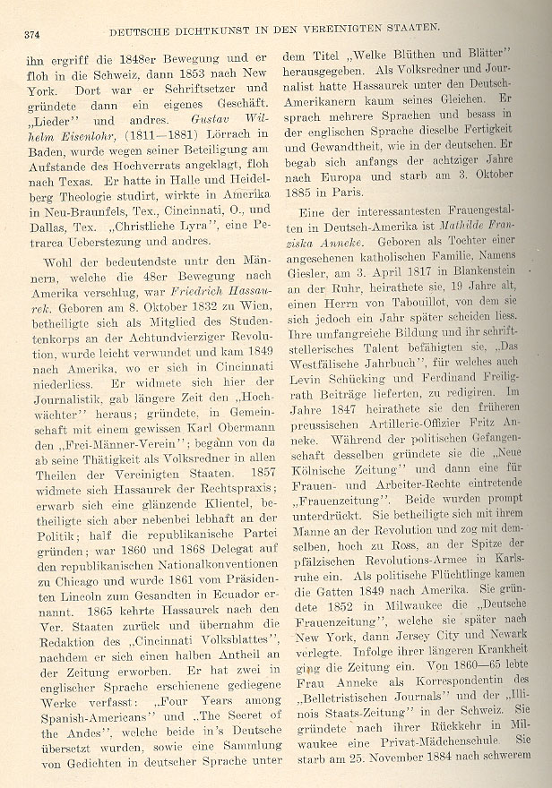 Also affected by the 1848 Movement, he fled to Switzerland and then to New York in 1853. There he was a typesetter and he established his own business. He wrote Lieder, etc. Gustav Wilhelm Eisenlohr (1811 - 1881) from Lörrach in Baden, was accused of high treason because of his participation in the revolution. He fled to Texas. He studied theology in Halle and Heidelberg and worked in America in Neu-Braunfels, Texas, Cincinnati, Ohio and Dallas, Texas. He wrote Christliche Lyra, a Petrarch translation and other works.