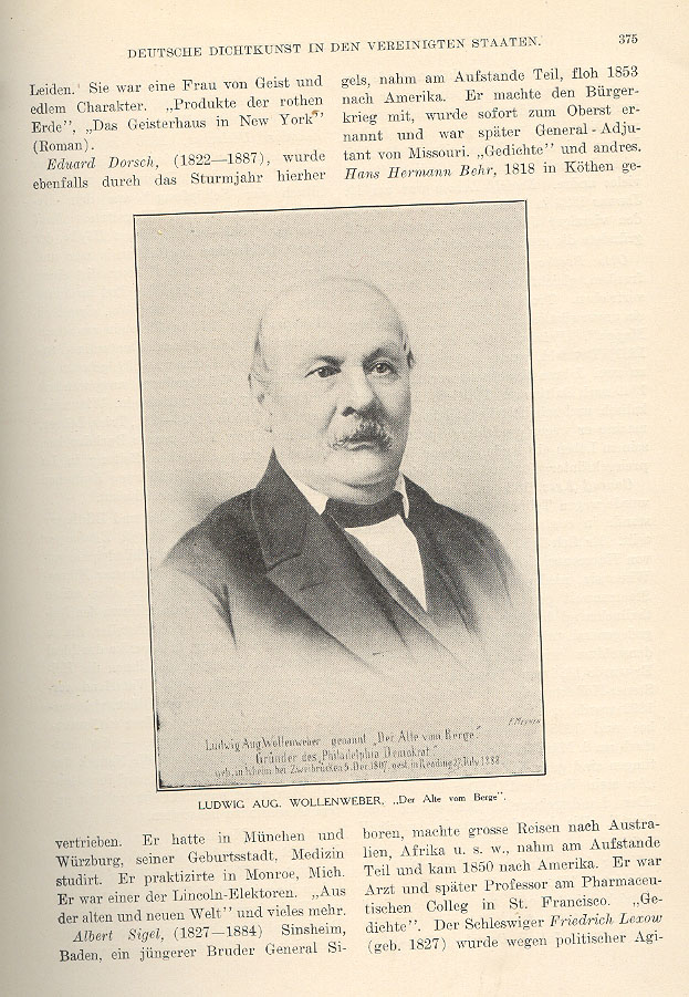 Eduard Dorsch (1822 - 1887) was also driven here by the Storm Year. He studied medicine in Munich and Würzburg, the city of his birth. He practiced in Monroe, Michigan. He was one of the electors of Lincoln. He wrote From the Old and New World and other works. Albert Sigel (1827 - 1884) from Sinsheim, Baden was a younger brother of General Sigel. He took part in the revolution and fled to America in 1853. He enlisted in the Civil War and was immediately made a colonel. Later he became an adjutant-general from Missouri. He wrote poetry and other pieces. Hans Hermann Behr, born in 1818 in Köthen, made grand treks to Australia, Africa, etc. He took part in the revolution and came to America in 1850. He was a physician and later a professor at the Pharmaceutical College in San Francisco. He wrote poetry. The Schleswiger Friedrich Lexow (born 1827) was sentenced to eight years imprisonment for political agitation, _____ Caption under picture reads Ludwig Aug. Wollenweber, "The Old Man of the Mountain."