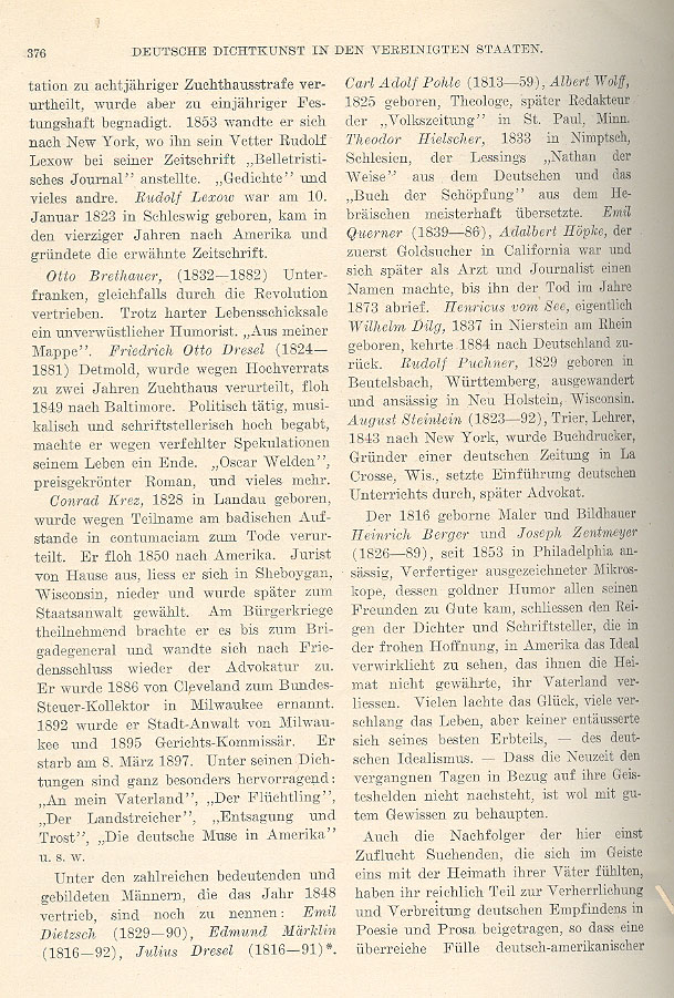Otto Brethauer (1832 - 1882) from Lower Franken, also expelled because of the revolution. Despite difficult life circumstances he was an irrepressible humorist. He wrote From My Portfolio. Friedrich Otto Dresel (1824 - 1881) from Detmold, was sentenced to two years imprisonment for high treason and fled to Baltimore in 1849. Politically active, highly gifted musically and literarily, he ended his own life because of bad financial specuations. He wrote Oscar Welden, prize-winning novels and other works. Conrad Krez, born in 1828 in Landau, was sentenced to death in absentia for his part in the Baden revolution. He fled to America in 1850. He was an attorney. He settled in Sheboygan, Wisconsin and later was appointed to the State Attorney General's Office. Taking part in the Civil War, he reached the rank of Brigadier General. After the war he again became an attorney. In 1886 he was appointed by Cleveland Federal Tax Collector in Milwaukee. In 1892 he became State's Attorney for Milwaukee and in 1895 Commissioner of Courts. He died March 8, 1897. Among his writings of particular greatness are: To My Fatherland, The Refugee, The Vagrant, Renunciation and Consolation, The German Muse in America, etc. Among the numerous important and educated men, who set the year 1848 in motion, these too may be named: Emil Dietzsch (1829 - 90), Edmund Märklin (1816 - 92), Julius Dresel (1816 - 91), Carl Adolf Pohle (1813 - 59), Albert Wolff, born 1825, a theologian, who later became editor of the Volkszeitung in St. Paul, Minnesota. Theodor Hielscher, born in 1833 in Nimptsch, Silesia, provided masterful translations of Lessing's Nathan the Wise from the German and the Book of Creation from the Hebrew. Emil Querner (1839 - 86), Adalbert Höpke, who first sough gold in California and later made his name as a physician and journalist until death took him in 1873. Henricus vom See was born with the name Wilhelm Dilg in Nierstein on the Rhine in 1837. He returned to Germany in 1884. Rudolf Puchner was born in Beutelsbach, Württemberg in 1829, emigrated and settled in Neu Holstein, Wisconsin. Heinrich Berger, a painter and sculptor born in 1816, and Joseph Zentmeyer (1826 - 89), who settled in Philadelphia in 1853, was a manufacturer of excellent microscopes, and had a golden sense of humor, which amused all his friends, round out the list of poets and writers, who abandonned their fatherland and lived in the hope of seeing the ideal, which their homeland did not esteem, come to fruition in America. Luck smiled upon many of them, life devoured some, but none renounced his greatest legacy, — German Idealism. — In good conscience one may declare that the new times did not fall short of the bygone era when it came to its intellectual heros. The next generation of immigrants, who, unlike those seeking asylum, felt themselves spiritually united with the homeland of their fathers, also richly contributed to the glorification and expansion of German sentiment in prose and poetry and thus testified to the superabundant plenum of German-American |