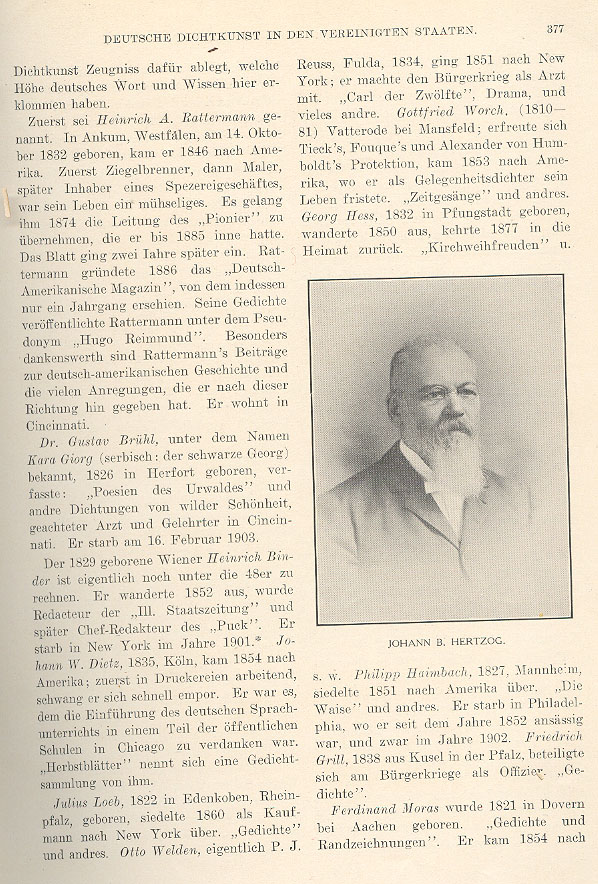 First of all let Heinrich A. Rattermann be named. Born on October 14, 1832 in Ankum, Westphalia, he came to America in 1846. As a brick maker, then a painter and later an owner of a grocery store, his life was difficult. In 1874 he succeeded in taking over the leadership of the Pioneer, which he owned until 1885. The paper ceased publication two years later. In 1886 Rattermann founded the German-American Magazine, which was published only for one year. Rattermann published his poetry under the pseudnym "Hugo Reimmund." Especially worthy of gratitude are Rattermann's contributions to German-American history and the many suggestions he made in pursuing this course. He lives in Cincinnati. Dr. Gustav Brühl, known by the name Kara Georg (Serbian for Black George), was born in 1826 in Herfort and compiled Poetry of the Primal Forest and other poetic works on wilderness beauty. He was a respected physician and teacher in Cincinnati. He died February 16, 1903. Heinrich Binder, born in Vienna in 1829, may still be counted among the 48ers. He emigrated in 1852 and became editor of the Illinois Staatszeitung and later chief editor of Puck. He died in New York in 1901. Johann W. Dietz, born in Cologne in 1835, came to America in 1854. At first he worked in the printing trade and he ascended the ranks quickly. It was he, whom we must thank for the introduction of German language instruction in a part of the Chicago Public School system. Autumn Leaves is the title of a collection of poetry by him. Julius Loeb, born in Edenkoben of the Rhine Palatinate in 1822, settled in New York in 1860 and worked as a merchant. He wrote poetry and other works. Otto Welden, known as P. J. Reuss, was born in Fulda in 1834. He came to New York in 1851. He was a physician in the Civil War. He wrote Charles XII, dramas and other works. Gottfried Worch (1810 - 81) came from Vatterode near Mansfeld. He enjoyed the protection of Tieck, Fouque and Alexander von Humboldt. He came to America in 1853, where he made his living as a special occasions poet. He wrote Songs of Time and other works. Georg Hess, born in Pfungstadt in 1832, emigrated in 1850 and returned to his homeland in 1877. He wrote Joys of a Church Festival and other works. Philipp Haimbach, born in Mannheim in 1827, settled in America in 1851. He wrote The Orphan and other works. He died in Philadelphia in 1902, having settled there in 1852. Friedrich Grill, born in Kusel in the Palatinate in 1838, took part in the Civil War as an officer. He wrote poetry. Ferdinand Moras was born in Dovern near Aachen in 1821. He wrote Poetry and Marginal Sketches. He came to Philadelphia in 1854 _____ Caption under picture reads Johann B. Hertzog. Go to Pages 378 - 382 Return to Cover, Title & Index |