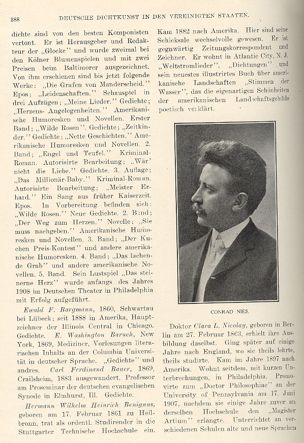 He was publisher and editor of the Glocke. He twice received recognition at the Cologne Flower Festival and he received two prizes from the Baltimore Flower Festival. From him we have the following works: The Countess of Manderscheid, epics and Passions; he wrote a drama in three acts and My Songs, poetry, Affairs of the Heart and American humorous stories and novellas. In the first volume of his work we find: Poetry - Wild Roses, Children of the Age, Pleasant Histories and American Humorous Stories and Novellas. In Volume 2: Angel and Devil, a criminal novel - authorized edition; Meister Erhard, a song of the previous empire; epics. In an earlier version Wild Roses, new poetry, second edition; The Way to Heaven, a novella; She Must Yield, American Humorous Stories and Novellas. Volume 3: The Cooking Prize Contest and other American humorous stories. Volume 4: The Smiling Grave and other American novellas. Volume 5: His comedy The Stony Heart, which was successfully produced at the beginning of 1908 in the Germany Theater in Philadelphia. Ewald F. Bargmann, born in Schwartau near Lübeck in 1860, has been in America since 1888. He was head draftsman of the Illinois Central in Chicago. He wrote poetry. E. Washington Baruch, born in New York 1869, was a physician and lecturer on literary holdings in the German language at Columbia University. He wrote poetry and other works. Carl Ferdinand Bauer, born in Crailsheim in 1869, emigrated in 1883. He was professor at the prose seminary of the German Evanglical Synod in Elmhurst, Illinois. He wrote poetry. Hermann Wilhelm Heinrich Benignus, born on February 17, 1861 in Heilbronn, enrolled as an ordinary student at the Stuttgart Technical High School. He came to America in 1882. Here his destiny underwent several changes. He is currently a newspaper correspondent and illustrator. He lives in Atlantic City, New Jersey. He wrote Songs of the World River, Compositions and his newest illustrated book on the American landscape, Voices of the Water, which poetically glorifies the unique beauty of the American landscape. Dr. Clara L. Nicolay, born in Berlin on February 27, 1863, received her education there. Later she went to England for a few years, where she taught and studied. In 1897 she came to America. Except for a few hiatuses, she has lived in Philadelphia. She received her doctorate in philosophy at the University of Pennsylvania on June 17, 1907, after attending there for a few years, first completing her Master of Arts degree. She taught ancient and modern languages at various schools _____ Caption under picture at right center reads Conrad Nies. |