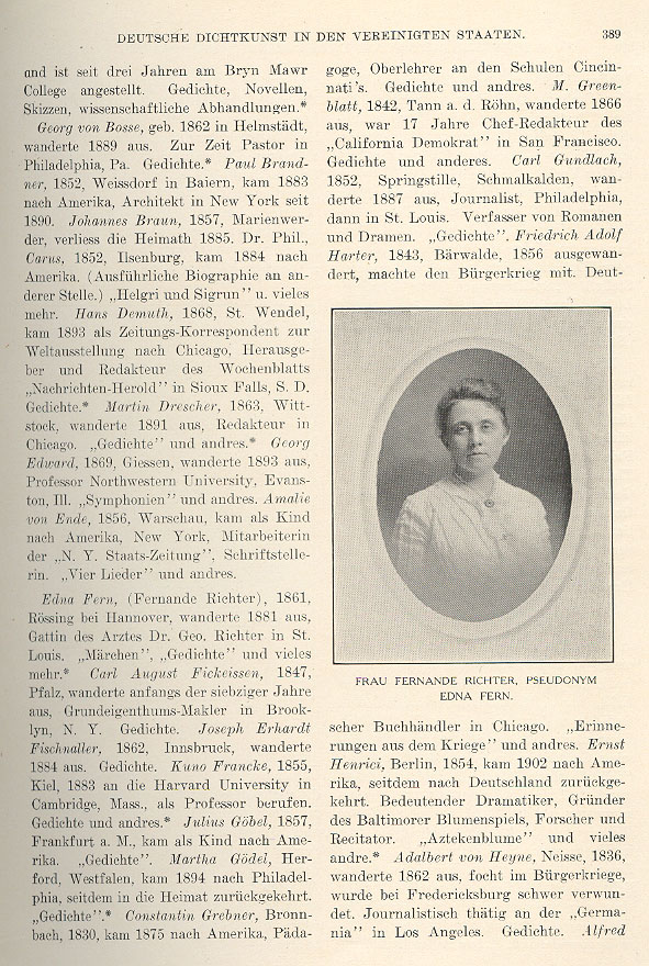 Georg von Bosse, born in Helmstädt in 1862, emigrated in 1889. At present he is a pastor in Philadelphia, Pennsylvania. He wrote poetry. Paul Brandner, born in Weissdorf, Bavaria in 1852, came to America in 1883. He has been an architect in New York since 1890. Johannes Braun, born in Marienwerder in 1857, left the homeland in 1885. Doctor of Philosophy Carus, born in Ilsenburg in 1852, came to America in 1884. (His biography is found in another section of this book.) He wrote Helgri and Sigrun and many other works. Hans Demuth, born in St. Wendel in 1868, came in 1893 as a newspaper correspondent to the World Exhibition in Chicago. He was publisher and editor of a weekly newspaper, the Nachrichten-Herold in Sioux Falls, South Dakota. He wrote poetry. Martin Drescher, born in Wittstock in 1863, emigrated in 1891. He was an editor in Chicago. He wrote Poetry and other works. Georg Edward, born in Giessen in 1869. emigrated in 1893. He was a professor at Northwestern University in Evanston, Illinois. He wrote Symphony and other works. Amalie von Ende, born in Warsaw in 1856, came as a child to America and settled in New York. She was a contributor to the New York Staats-Zeitung and a writer. She wrote Four Songs and other works. Edna Fern (Fernande Richter), born in Rössing near Hannover in 1861, emigrated in 1881. She was the wife of physician Dr. Geo. Richter in St. Louis. She wrote A Fairy Tale, Poetry and many other works. Carl August Fickeissen, born in the Palatinate in 1847, emigrated at the beginning of the 1870s. He was a real estate broker in Brooklyn, New York. He wrote poetry. Joseph Erhardt Fischnaller, born in Innsbruck in 1862, emigrated in 1884. He wrote poetry. Kuno Francke, born in Kiel in 1855, was appointed a professor at Harvard University in Cambridge, Massachusetts in 1883. He wrote poetry and other works. Julius Göbel, born in Frankfurt on the Mainz in 1857, came as a child to America. He wrote Poetry. Martha Gödel, born in Herford Westphalia, came to Philadelphia in 1894. She has since returned to the homeland. She wrote Poetry. Constantin Grebner, born in Bronnbach in 1830, came to America in 1875. He was a pedagogue and secondary school teacher in the schools in Cincinnati. He wrote poetry and other works. M. Greenblatt, born in Tann on the Rhone in 1842, emigrated in 1866. For 17 years he was chief editor for the California Demokrat in San Francisco. He wrote poetry and other works. Carl Gundlach, born in Springstille, Smalkaldia in 1852, emigrated in 1887. He was a journalist in Philadelphia and then St. Louis. He was a writer of novels and dramas and Poetry. Friedrich Adolf Harter, born in Bärwalde in 1843, emigrated in 1856 and took part in the Civil War. He was a German book dealer in Chicago. He wrote Memories of the War and other works. Ernst Henrici was born in Berlin in 1854. He came to America in 1902 and has since returned to Germany. He was a prominent dramatist, founder of the Baltimore Flower Festival, researcher and recitationist. He wrote Aztec Blossoms and many other works. Adalbert von Heyne, born in Neisse in 1836, emigrated in 1862. He fought in the Civil War and was seriously wounded at Fredericksburg. He was employed as a journalist at the Germania in Los Angeles. He wrote poetry. _____ Caption under picture at right center reads Mrs. Fernande Richter, pseudonym Edna Fern. |