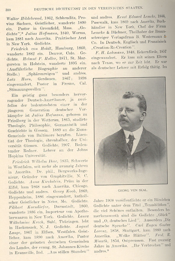 Julius Hoffmann, born in Worms in 1840, came to America in 1881. He was a practicing physician in New York. He wrote poetry. Friedrich von Holdt, born in Hamburg in 1860, emigrated in 1882. He settled in Denver, Colorado. He wrote poetry. Helmut P. Holler, born in St. Margareten, Holstein in 1871, emigrated in 1895. (His biography is in a different section of thie book.) He wrote Spherical Rondeau and other works. Lutz Horn, born in Gerdauen in 1867, emigrated in 1898. He was a pastor in Fresno, California. He wrote Waves of Voices. Julius Hofmann is an especially prominent German-American intellectual, indeed he is without a doubt one of the most important of the younger generation of German pioneers. He was born in Friedberg in the Wetterau in 1865, studied theology, philosophy, Germanics and history in Giessen. In 1889 he was appointed to the Zion congregation in Baltimore. He has an honorary doctorate in theology from the University of Giessen. He wrote poetry, published in 1907. He is a prominent lecturer and a teacher at Johns Hopkins University. Friedrich Wilhelm Ihne, born in Schwerte, Westphalia in 1835, has been in America for more than twenty years. He has his doctorate in mine engineering. He is the founder of Graphitville, North Carolina. He writes poetry. Anna Kirchstein, from Prüm on the Eifel, came to America in 1868 and settled in Chicago. She wrote poetry and other works. Georg Koob, born in Heppenheim in 1869, emigrated in 1886. He was a Catholic priest in Neier, Missouri. He wrote poetry. Filibert Korndörfer born in Darmstadt in 1860, emigrated in 1886. He was an importer of apothecary wares in New York. He wrote poetry. Laura Wilhelmina Krech, from Suhl, Thuringia, lives in Hackensack, New Jersey. She writes poetry. August Lange, born in Elfsen, Westphalia in 1867, is a minister, who came to America in 1890. He is pastor of one of the largest German congregations in the country, the Evangelical St. John's Church in Evansville, Indiana. He wrote In the Quiet Hours and other works. Ernst Eduard Lemcke, born in Pasewalk in 1844, came to America in 1869. He was a book dealer in New York, head of the firm Lemcke & Büchner, a partner of the Braunschweig publishing firm of B. Westermann & Co. He wrote in German, English and French Creation-Re-Creation. F. H. Lohmann, born in Eckernförde in 1857, emigrated. He came with his parents to Texas, where he lives to this day. He was successfully active as a German teacher. In 1908 he published a small volume of poetry under the title Texas Blossoms, which contains many beautiful works. Especially worthy of note are the poems Happiness and Oh, German Song. He also wrote The German Languages. Carl Eugen Gustav Lorenz, born in Stuttgart in 1858, came to America in 1880. He wrote Withered Leaves. Fred R. Minuth was born in East Prussia in 1854. He has been in America for nearly twenty years. He wrote Her Crimes and other works. _____ Caption under picture at right center reads Georg von Skal. |