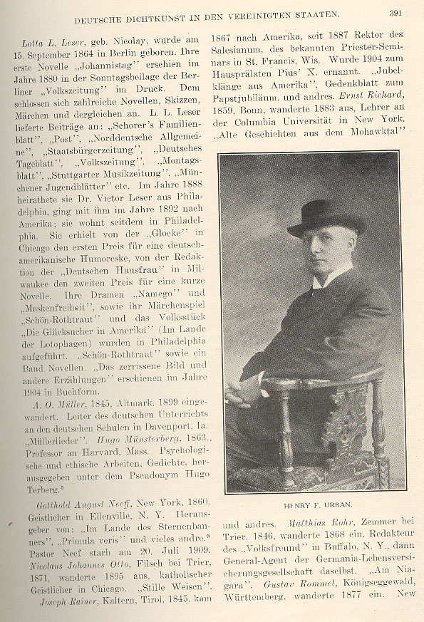 A. O. Müller, born in Altmark in 1845, emigrated in 1899. He was head of German Instruction at the German Schools in Davenport, Iowa. He wrote Miller Songs. Hugo Münsterberg, born in 1863, was a professor in Harvard, Massachusetts. He wrote psychological and ethical works and poetry. He wrote under the pseudonym Hugo Terberg. Gotthold August Neeff (2), born in New York in 1860, was a minister in Ellenville, New York. He was the publisher of In the Land of the Star Spangled Banner, Primula Veris and many other works. Pastor Neeff died on July 20, 1909. Nicolaus Johannes Otto, born in Filsch near Trier in 1871, emigrated in 1895. He was a Catholic priest in Chicago. He wrote Quiet Habits. Joseph Rainer, born in Kaltern, Tyrolia in 1845, came to America in 1867. Since 1877 he has been rector of Salesianum, the well known priests' seminary in St. Francis, Wisconsin. In 1904 he was appointed house prelate by Pius X. He wrote Jubilant Chimes from America, a commemorative piece for the pope's jubilee and other works. Ernst Richard, born in Bonn in 1859, emigrated in 1883. He was an instructor at Columbia University in New York. He wrote Old Stories from the Mohawk Valley and other works. Matthias Rohr, born in Zemmer near Trier in 1846, emigrated in 1868. He was editor of the Volksfreund in Buffalo, New York and then a general agent for the Germania Life Insurance Company, also in Buffalo. He wrote At Niagara. Gustav Rommel, born in Königseggewald, Württemberg, emigrated in 1877. _____ Caption under picture at right center reads Henry F. Urban. (1) Portrait of Mrs. Leser can be found on page 385. Return to text (2) Portrait of Gotthold August Neeff can be found on page 387. Return to text |