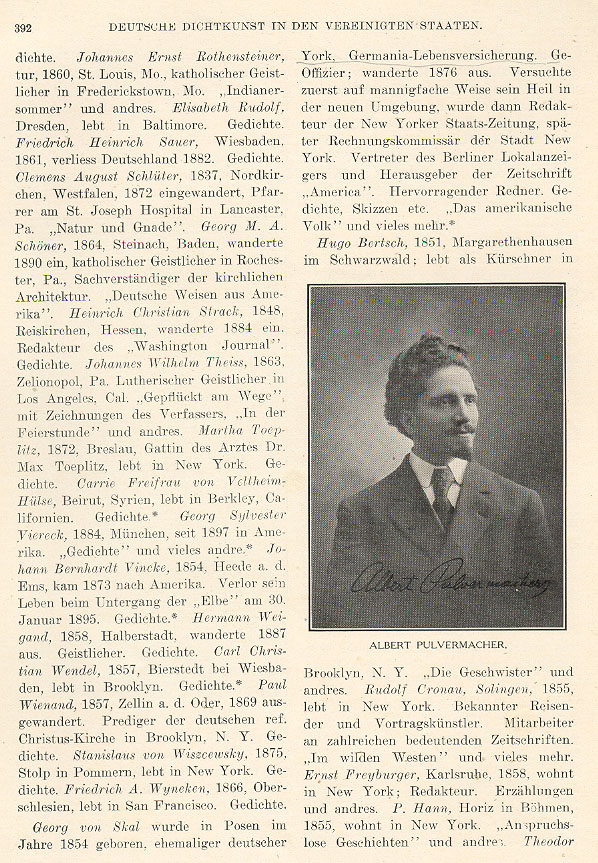 Johannes Ernst Rothensteiner, St. Louis Missouri in 1860, was a Catholic priest in Frederickstown, Missouri. He wrote Indian Summer and other works. Elisabeth Rudolf, born in Dresden, lives in Baltimore. She writes poetry. Friedrich Heinrich Sauer, born in Wiesbaden in 1861, left Germany in 1882. He wrote poetry. Clemens August Schlüter, born in Nordkirchen, Westphalia in 1837, emigrated in 1872. He was a pastor at St. Joseph's Hospital in Lancaster, Pennsylvania. He wrote Nature and Grace. Georg M. A. Schöner, born in Steinach, Baden in 1864, emigrated in 1890. He was a Catholic priest in Rochester, Pennsylvania and an expert in church architecture. He wrote German Customs in America. Heinrich Christian Strack, born in Reiskirchen, Hessen in 1848, emigrated in 1884. He was editor of the Washington Journal. He wrote poetry. Johannes Wilhelm Theiss, born in Zelionopol, Pennsylvania in 1863, was a Lutheran minister in Los Angeles, California. He wrote Plucked Along the Way with illustrations by the author, In the Festive Hours and other works. Martha Toeplitz, born in Breslau in 1872, was the wife of physician Dr. Max Toeplitz and lived in New York. She wrote poetry. Carrie, Baroness of Veltheim-Hülse, was born in Beirut, Syria and lives in Berkeley, California. She writes poetry. Georg Sylvester Viereck, born in Munich in 1884, has been in America since 1897. He wrote Poetry and many other works. Johann Bernhardt Vincke, born in Heede on the Ems in 1854, came to America in 1873. He lost his life with the sinking of the "Elbe" on January 20, 1895. He wrote poetry. Hermann Weigand, born in Halberstadt in 1858, emigrated in 1887. He was a minister. He wrote poetry. Carl Christian Wendel, born in Bierstadt near Wiesbaden in 1857, lives in Brooklyn. He writes poetry. Paul Wienand, born in Zellin on the Oder in 1857, left in 1869. He was preacher of the German Reform Christ Church in Brooklyn, New York. He wrote poetry. Stanislaus von Wyneken, born in Upper Silesia in 1866, lives in San Francisco. He writes poetry. Georg von Skal (1) was born in Posen in 1854. There he was a German officer. He emigrated in 1876. He tried his luck at various things in the new environment and then became editor of the New York Staats-Zeitung and later Commissioner of of Accounting for the State of New York. He was a representative for the Berliner Lokalanzeiger and publisher of the periodical America. He was a prominent orator. He wrote poetry, sketches, etc., The American People and many other works. Hugo Bertsch, born in Margarethenhausen in the Black forest in 1851, lives as a furrier in Brooklyn, New York. He wrote The Siblings and other works. Rudolf Cronau, born in Solingen in 1855, lives in New York. He is a well known traveler and recitationist. He is a contributor to many prominent periodicals. He wrote In the Wild West and many other works. Ernst Freyburger, born in Karlsruhe in 1858, lives in New York. He wrote Unassuming Stories and other works. _____ Caption under picture at right center reads Albert Pulvermacher. (1) Picture of Georg von Skal can be found on page 390. Return to text Go to Pages 393 - 397 Return to Cover, Title & Index |