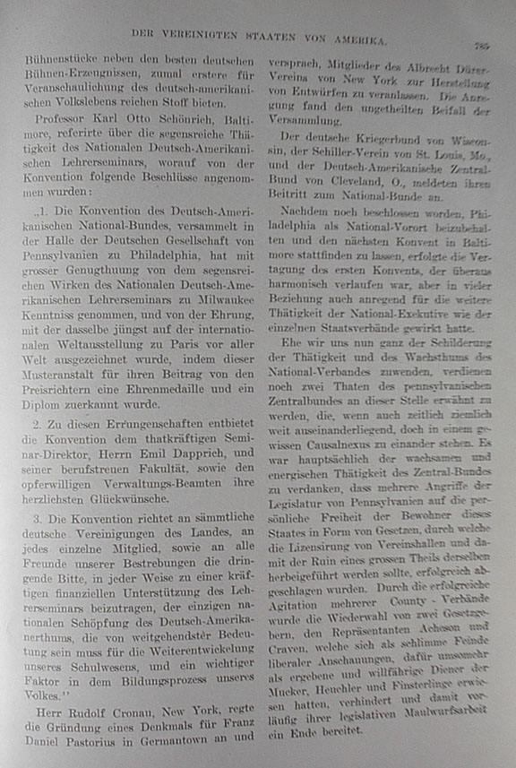 theatrical works along with the best German stage productions; the former would offer rich material for demonstrations of German-American life. Professor Karl Otto Schönrich of Baltimore presided over a discussion of the blessed activity of the National German-American Teachers Seminary, where upon the following resolutions were passed by the delegates: "1. The convention of the National German-American Alliance, assembled in the hall of the German Society of Pennsylvania in Philadelphia, has taken great satisfaction in the bountiful work of the National German-American Teachers Seminary in Milwaukee and the honor it received recently at the International World Exposition in Paris, where this model institute was awarded a medal of honor and a diploma by the prize judges for its contributions. "2. The convention offers its heartiest congratulations for this achievement to the energetic seminary director, Mr. Emil Dappich, and his professional staff along with its devoted administrative officers. "3. The convention extends an urgent plea to all the German societies in the country, all their individual members and all friends of our efforts to contribute in whatever way possible towards energetic financial support for the Teachers Seminary, the only national creation of the German-American people. The seminary has great significance because it assures the continuing development of our schools, an important factor in the education process of our people." Mr. Rudolf Cronau of New York suggested the placing of a memorial to Franz Daniel Pastorius in Germantown and promised to get the members of the Albrecht Dürer Society of New York to produce the sketches. The suggestion received unanimous applause from the assembly. The German Warriors Alliance of Wisconsin, the Schiller Society of St. Louis, Missouri and the German-American Central Alliance of Cleveland, Ohio, announced their enrollment in the National Alliance. After the decision was made to keep Philadelphia as the national headquarters and to hold the next convention in Baltimore, the first convention was adjourned. The proceedings had gone smoothly but there had been many suggestions for further action on the part of the National Executive Board, such as those actions taken by the individual state associations. Before we turn to a description of their actions and the growth of the national associations, two deeds of the Pennsylvania Central Alliance are deserving of mention here, and although they are appear to be isolated actions, when set down together there exists a certain causal connection. It is mainly thanks to the vigilance and energetic actions of the Central Alliance that multiple assaults made by the Pennsylvania Legislature on the personal freedom of residents were put down - the Legislature had tried to enact laws requiring the licensing of association halls. This would have led to the ruin of a larger portion of them. Through the successful agitation by many county associations, two lawgivers, Representatives Acheson and Craven, were recalled and hindered so that their legislative "mole's work" was brought to an end. These men had proven themselves evil foes of liberal views and as such they were willing and compliant servants of the muckrakers, the hypocrites and the bigots. |