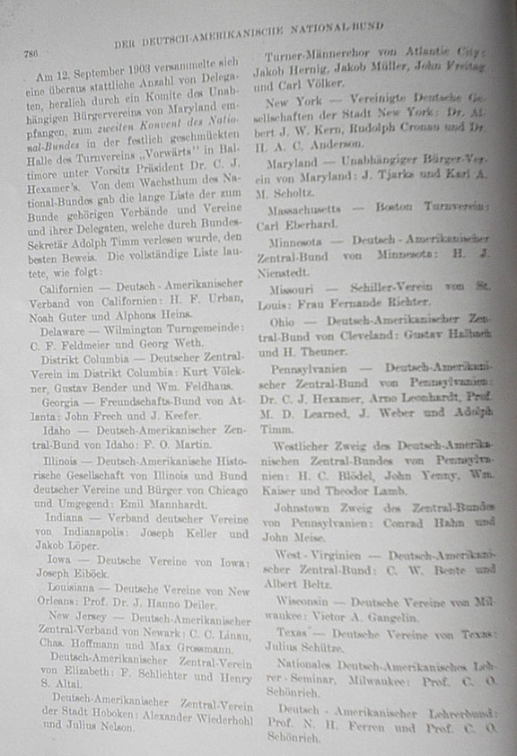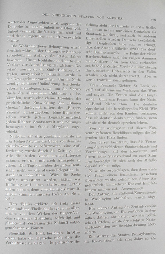"The truth in this statement was demonstrated during the session of the State Legislature at the beginning of last year. Our legal advisor drafted a proposed amendment to the Blue Laws as they apply to the City of Baltimore, which was then submitted to the Legislature. In order to make it clear to the Legislature why it was necessary to amend the law and to combat the bias of the general public, a small brochure, which laid out the history of the Blue Laws, was published by the Citizens Association. A copy of the same was sent to every member of the Legislature, every judge, states attorney and newspaper publisher in the State of Maryland. "After all this was accomplished, a day was set aside on which to advocate the issue before the Legislative Committee. A request was placed in the newspapers to all, who had an interest in the amendments, to come to Annapolis. The day arrived but not the Germans — the mass delegation consisted of eight men. If the matter had been energetically supported, we would have had some hope for at least a partial victory, since many of the members of the Legislature agreed with our public sentiments." Mr. Tjarks stated that despite the evident lack of public participation he was generally satisfied with the work of the Citizens Association since its establishment and he trusted that it could meet the challenges of the future. Nienstädt of St. Paul reported that in Minnesota, Germans have nothing to complain about concerning various issues. With regard to political situations the German finds himself at the forefront; that is, there is a German as State Treasurer and Germans are considered for other positions of honor. It's also been conceded that the State will designate $2000 each year for German books. As a result of reports from many church schools and the constant complaints of politicians that there is no money at had, the Central Association has not yet followed through on proposals for the introduction of German instruction in the public schools. However it will eventually prevail. Mrs. Fernande Richter of St. Louis spoke of universal demands: "Women are key to the issue. Without us women the National Alliance can do nothing. The German language is not a piece of ready-made clothing. We cannot demand of our children that they think and feel German if we do not teach them to speak German." Among the most important resolutions passed at the convention we list the following: New Jersey proposed that the representation of the various state associations and societies at conventions, which is currently set at two votes per state, be set in proportion to number of members. It was proposed that this important question be turned over for consideration by a special committee, which would render recommendations at the next convention. Accepted. The proposal, to abstain from holding any national conventions in Washington, was rejected. Another proposal from the Central Association of Washington, to abstain from holding more than one convention per year like the political parties, was held over for consideration until the next national convention. A proposal from the State of Pennsylvania to alternate the convention venue so that Go to Pages 790 - 794 |