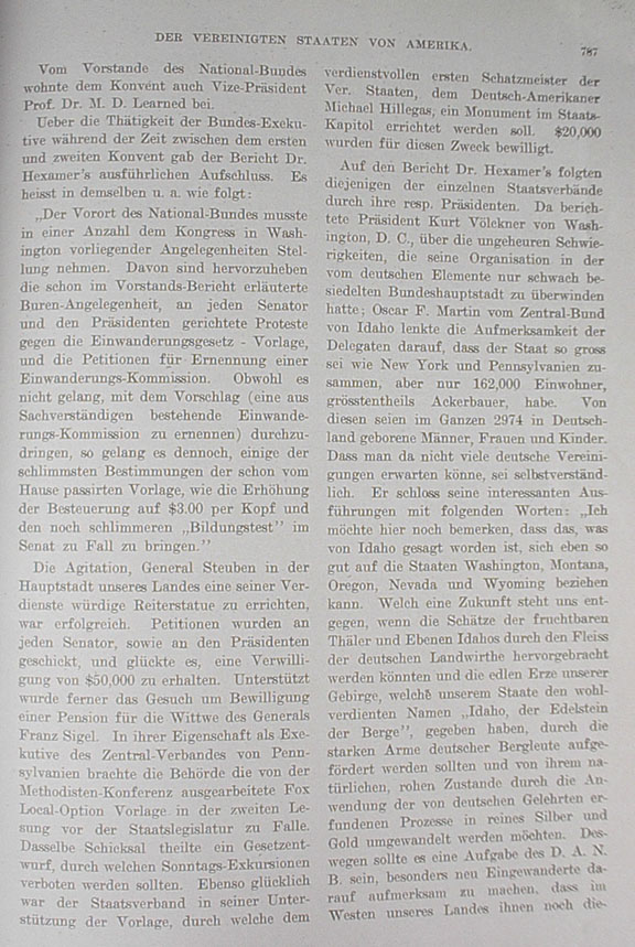 The report presented by Dr. Hexamer gave detailed information on the activity of the Alliance's Executive Board between the first and second convention. Among other things the following was stated: "The Headquarters of the National Alliance had to take a position in a number of issues before the Congress in Washington. Of these we need to give special attention to one such issue, previously mentioned in the committee's report describing the Buren matter, in which protest has been registered with every senator and the president concerning the proposal of immigration legislation and petitions for the appointment of an immigation commission. Although the proposal (to appoint a panel of experts for an immigration commission) did not pass, by a narrow margin the House passed other propositions, such as the raising of the duty tax to $3.00 per person and the even more dreadful "Education Test," which now goes to the Senate for vote. Efforts to erect in our country's capitol a statue of General Steuben on horseback, a tribute worthy of his service, were successful. Petitions were sent to every senator and the president and they were rewarded with an endowment of $50,000. Support was also sought for the granting of a pension to the widow of General Franz Sigel. In its capacity as Executive Board of the Central Association of Pennsylvania, the Board brought the Fox Local-Option Proposal, drafted at the Methodist Conference, to a second reading in the State Legislature. The same fate awaits proposed legislation, which forbids Sunday excursions. Just as successful was the State Association's support of proposals, through which a well deserved monument shall be erected in the State Capitol to the German-American, Michael Hillegas, who was the first Treasurer of the United States. After Dr. Hexamer's report followed those of the individual State Associations through their respective presidents. President Kurt Völckner of Washington, D.C. reported about the terrible difficulties, which his organization had to overcome since the nation's capitol has only a small number of residents of German heritage. Oscar F. Martin of the Central Alliance of Idaho drew the delegates' attention to the fact that his state is as large as New York and Pennsylvania put together but it only has 162,000 inhabitants, mostly farmers. Of this number there are 2974 men, women and children, who were born in Germany. It's self-evident that there won't be many German associations forming there. He closed his interesting address with the following words: "I would like to remark here that what has been said about Idaho also holds good for the states of Washington, Montana, Oregon, Nevada and Wyoming. What a future is in store for us if the bounty of the fruitful valleys and plains of Idaho is brought forth by the hard work of German agriculturalists and the treasures of the mines in our mountains, from which our state earns the name 'Idaho, the Jewel of the Mountains,' should be unearthed by the strong army of German mountaineers, taken from their natural state and refined into pure silver and gold by Germans, schooled in the methods of processing. For this reason it should be the task of the D. A. N. B. [National German-American Alliance] to especially make new immigrants aware that the western regions of our country still offer them the same opportunities, which our fathers and grandfathers had in the East and the Mississippi Valley." |