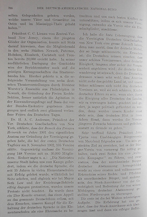 Dr. H. A. C. Anderson, president of the United German Societies of New York, announced that the visit of Prince Heinrich in 1901 has given momentum to the establishment of the United Societies, which by the first German Day celebration of November 9, 1902 numbered 105 societies. Currently the United Societies has 148 associations with about 30,000 members. Among other things the speaker stated: The Nativists of our state have provoked us to battle since the German language, which has been successfully taught in many elementary schools for the past 35 years, has been shoved aside; and although we registered vehement protest with Mayor Seth Low and the Board of Education, our protest was not heeded. A 25-member committee was appointed, an appeal was issued to the entire German community to consider our fight to maintain the German language in the elementary schools a matter of honor and to support us to the best of its ability by joining our union either as an association or as individual members. "I am fully convinced that the United German Societies of New York have a great future for as has been remarked, the slumbering German giant is waking; Germans must realize that our beautifully crafted societal existence will certainly fade into the past without German unity; German immigration is declining because Germans outside this country know well that America is no longer the promised land and our sons no longer join German associations because they are ashamed to be children of German parents; if, however, we bring all the Germans of this country together in one united cause, it will be heeded, respected and even politically feared; then our children will be proud that German blood flows in their veins, then the associations will obtain younger members and flourish instead of dying." President John Tjarks of the Independent Citizens Association of Maryland gave the following well-chosen remarks:
