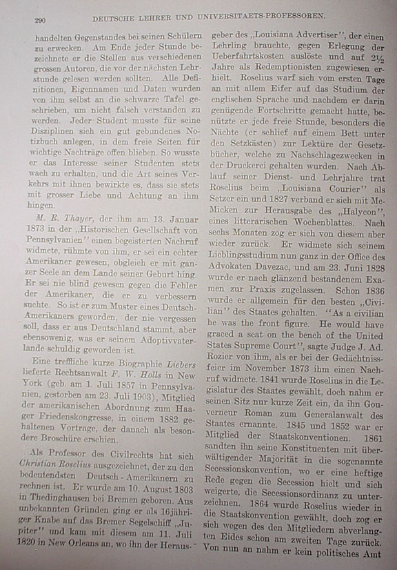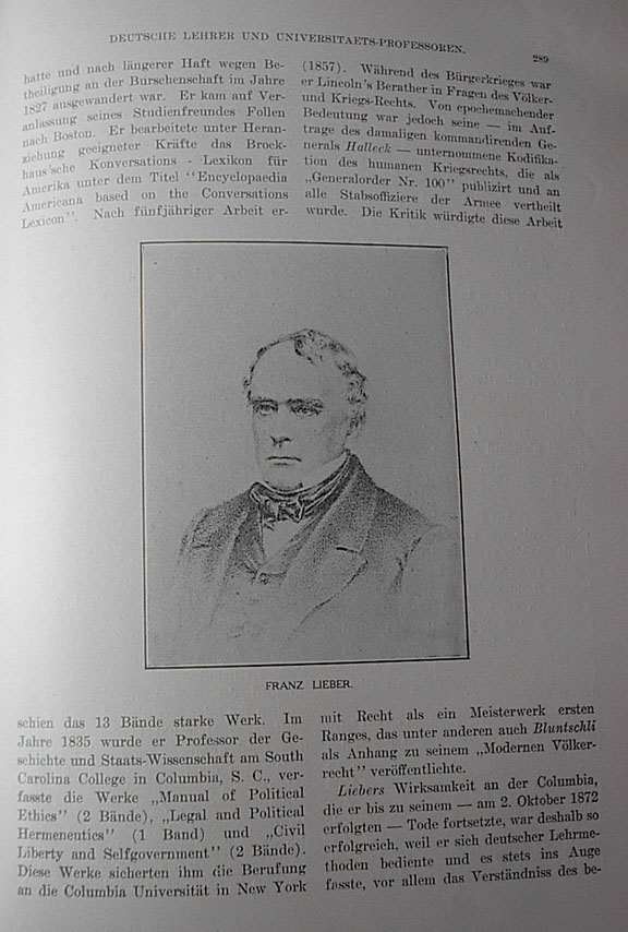 starting from the last paragraph of page 288 Franz Lieber may be listed among the most important university instructors of American History. He was born in Berlin on March 18, 1800. He was wounded in 1815 during the Napoleonic War. He fought for the Greeks. |