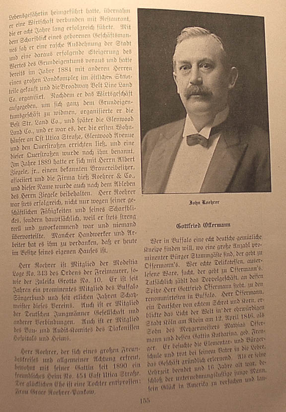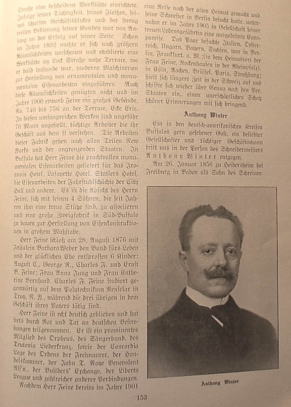 Biographies for Frederick L. Hartmayer, August Feine, Anthony Winter, Heinrich Sauerwein, and John Roehrer Frederick L. Hartmayer - German text for this biography begins on page 150 found at Webpage 14 Mr. Frederick L. Hartmayer, a well known businessman as well as a prominent and popular member of the Orpheus, was born on March 24, 1866 in Buffalo. He was the son of respected German pioneer Mr. Johann Lukas Hartmayer and his wife, Anna Maria. He attended the public schools. Afterwards he went into the paper and twine dealers trade. For a long time he was self-employed. Many years ago he joined the well known firm of Howard H. Baker & Co., a commodities shipping concern. His diligence, energy, and hard work helped him to advance quickly to become one of the principle representatives of this renowned firm. ![]() Mr. Hartmayer received a proper German education. He is fluent in the German language and he regularly takes part in German activities. He became an active member of the Buffalo Orpheus 23 years ago. He's played a prominent role in this great singing society, one of the most famous in the land. For 15 years he has been a member of the Orpheus' administrative committee. During this time he has been a member of other prominent committees for this society. Additionally Mr. Hartmayer is a member of the German Young Men's Association, the Schiller Memorial Society, the National Geographic Society, the United Commercial Travelers, the Erie County S.P.C.A., and the Buffalo Ramblers Club, for which he was president for 3 years. He is a distinguished Free Mason, and a member of the Harmonia Lodge No. 699. He was Chairman of the State Lodge Assembly for 2 years. He's a member of the Past Masters Association, F. & A.M., and a member of the Omega Lodge No. 259, J.O.O.F. Mr. Hartmayer is a member of St. Paul's German Evangelical Church. In 1898 he married Miss Anna E. Keating. The happy marriage has produced 3 children: Herbert, 12; Frederick Jr., 10; and Raymund, 8. Mr. Hartmayer is a popular man and distinguished social figure. He has a large circle of friends. August Feine Mr. August Feine has an outstanding reputation in Buffalo's large iron industry. He can be proud of this accomplishment since it was earned through untiring effort and patience. He is a self-made man in the finest sense of the word. Mr. August Feine was born on June 9, 1851 in Kölleda, Thuringia. He was the son of honest townfolk. After leaving school he apprenticed in the honorable trade of locksmithing. When he completed his apprenticeship and studies of the trade he commenced his journeymanship. He worked for a while in Berlin, in various cities in Pommerania, and in Frankfurt on the Mainz. He was employed by masters in the trade for 7 years. His parents emigrated to the United States in 1879 and settled in Buffalo. Two years later on April 6, 1881 he sailed on the steamship Hapsburg from Bremen to the New World. He arrived in Buffalo on April 22nd. Here he found employment at Howard's Iron Works, then at the John T. Noye Mill Works. Later he went on to the Niagara Stamping & Tool Works Co. He then worked at the Franks Machine Works. In 1890 he became self-employed, establishing a workshop at the corner of Oak and Genesee Streets. Caption under picture at upper right reads Frederick L. Hartmayer ![]() Caption under picture reads August Feine and Sons ![]() His diligence, his hard work, his acute business sense, and his dedication to his trade were manifest from the beginning and led to his success. By 1892 he had to seek a larger facility. He established a shop on Lock Street near Terrace where it was his intention to introduce modern machine methods for the production of ornamental and structural iron works. With time there wasn't enough space so in 1900 Feine acquired a large building at 740 - 756 Terrace at the corner of Erie Street. Approximately 70 men are employed at this huge facility. These are men who know their business. The products of this facility go all over New York State and the rest of the country. Mr. Feine has manufactured beautiful pieces for the Iroquois Hotel, the Hotel Lafayette, and the Hotel Statler. He's produced the elevator shafts for City Hall and other places. It is Mr. Feine's intention, together with that of his 4 truly supportive sons, to expand and build a large subsidiary in South Buffalo in order to produce iron construction materials in mass quantities. Mr. Feine married Miss Barbara Weber on August 28, 1876. The happy marriage has produced 6 children: August C., George R., Charles F., Ernst B., Mrs. Anna Jung, and Mrs. Katherine Bernhard. Charles F. Feine is currently studying at Renselar [sic] Polytechnical Institute in Troy, N.Y. The 3 other sons are employed in their father's business. Mr. Feine has remained a true German. Through word and deed he has taken part in German activities. He is a prominent member of the Orpheus, the Sängerbund, the Teutonia Liederkranz, the Concordia Lodge Order of the Free Masons, the Chamber of Commerce, the John T. Noye Benevolent Association, the Builder's Exchange, the Liberty League, and several other associations. Mr. Feine made a trip back to the old fatherland in 1901 and visited his sister in Berlin. In 1905 he took an extended tour of Europe with his wife. The couple visited Italy, Austria, Hungary, Bavaria, and Saxony. They travelled to Berlin, Frankfurt on the Mainz, Rockhausen in the Rhine Palatinate (homeland of Mrs. Feine), Cologne, Aachen, Brussels, Paris, and Strassburg. They spent a little while in Switzerland and sailed back to the United States from Genoa. They brought back an incredible treasure chest of beautiful memories. Anthony Winter Master tailor Anthony Winter is a welcome guest in German-American circles. He's a popular social figure and a fine businessman. He was born on January 26, 1856 in Heidersheim near Freiburg in Baden. Caption under picture at lower right reads Anthony Winter ![]() He was the son of master carp