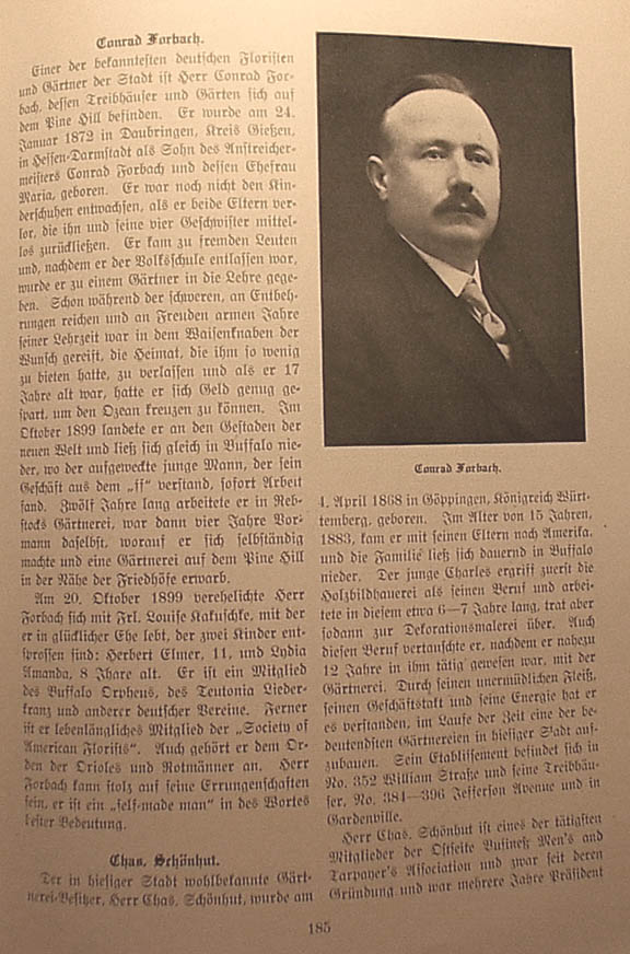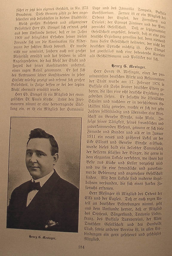 ![]() Georg L. Hager Mr. George L. Hager, one of the best known attorneys in the city, first saw the light of the world in Buffalo on September 16, 1867. He was the son of the hat and fur dealer John Hager. He attended the public schools, received further instruction in a private school, and then studied law. He became a clerk in the well known law firm of F.B. Steele and Edward C. Rischman. In 1901 he passed his exams with distinction in the Buffalo Law School and in the same year was admitted to the Bar. He established a lucretive practice for himself in 1904 with Lyman M. Baker under the firm name of Baker & Hager. When Baker died his son, Merritt N. Baker, became a partner. Mr. Hager's good reputation among his colleagues is evidenced by his election for a term as president of the Lawyers Club. He's also a member of the advisory committee of this club, as well as the Erie County and New York Bar Associations. Further proof of his ability and popularity comes from the fact that in the last election, held on November 7, 1911, he was a candidate for City Court Judge on the Republican ticket. He was elected to a 4 year term by a stiff Republican majority. In 1901 he married Miss Carrie R. Baker, daughter of his associate. The happy union has produced 2 children, Lyman B. and Clara Barbara. He lives with his family in a cosy little home at 759 Bird Avenue. Dr. Richard Taggesell In the beautiful city of Dresden in Saxony Dr. Richard Taggesell first saw the light of the world in 1870. He was the son of a respected merchant. He attended the schools in his father city and in Chemnitz. He then went to the University of Leipzig to study chemistry. He passed his exams with distinction. As an accomplished scientist he entered the firm of K. Oehler in Offenbach on the Mainz. His knowledge increased. In 1896 he came to America and settled immediately in Buffalo, having been offered a job at the large firm of Schöllkopf, Hartford & Co. He's worked for that firm ever since and he currently holds a management position. Caption under picture at upper right reads Georg L. Hager ![]() Dr. Taggesell is a member of the Buffalo Orpheus and the Schlaraffia. He's a welcome addition because of his friendly, open demeanor and his excellent personality. In 1900 he married Miss Zelmira Thorner. Twins, Carl and Richard, have come from the harmonious union. Gustav A.W. Frisch Gustav A.W. Frisch first saw the light of the world in Mohrungen, part of the legislative district of Königsberg. He was the son of master miller Michael E. Frisch and his wife Justina, nee Schulz. In 1881 the Frisch family emigrated to America and settled here in Buffalo. Gustav apprenticed in the jewelery, engraving, and watchmaking trade. He built his knowledge of the trade from the ground up. Later he educated himself to be an optician. In 1897 he opened his own business as an optician, jeweler, and watchmaker in the building at 443 Genesee Street. Mr. Gustav Frisch belongs to the 65th N.Y. Military Regiment, Company K. He holds the rank of captain. He is also a member of the Orpheus and the Sängerbund. He belongs to St. Paul's Church. Mr. Gustav A.W. Frisch has an excellent reputation as an honest and capable businessman in our city. Dr. Friedrich Frisch In 1881 E.H. Fritz Frisch came at the age of 9 with his parents and siblings from the legislative district of Königsberg, Germany to Buffalo. Here he finished his education in the public schools. Later he went to Germany for a year and studied mathematics and other subjects. Then he studied medicine at the University of Buffalo. Caption under picture at upper left reads Dr. Richard Taggesell Caption under picture at lower right reads Gustav A.W. Frisch ![]() He then completed the course of studies in ophthalmology at Harvard University. Afterwards he completed his training in general medicine in Albany and finished his qualifying state exams to become a physician and surgeon. In order to gain more experience in his fields of endeavor, he stayed at St. Peter's General Hospital in Albany as a resident physician. To further his training in ophthalmology Dr. Frisch went to Philadelphia, where he worked under the supervision of ophthalmologist Dr. Oliver at Wills Eye Hospital. While in residence there he received an offer from a former instructor at Harvard University to work as a resident at the Massachusetts Eye & Ear Infirmary. Dr. Frisch accepted the appointment and worked there for 2 years from 1907 to 1909. In the latter year Dr. Frisch decided to return to Buffalo, where he established his practice as an eye specialist. Dr. Frisch is a member of St. Paul's Church, the Orpheus Singing Society, the Modestia Lodge, the Erie County Medical Society, the New York State Medical Society, and the American Medical Association. Edward Stengel Aldermann Ed. Stengel is one of the most popular businessmen and citizens of the East Side. He first saw the light of the world on October 8, 1874. He was the son of food dealer John E. Stengel. He attended the public schools and went to a business college to become a bookkeeper. In 1891 he took a position in the offices of the New York Central Railroad. He gave up the position to pursue a business career in 1894 in a grocery store. Caption under picture at lower left reads Edward Stengel Caption under picture at upper richt reads Dr. Friedrich Frisch ![]() For 13 years now he's had his own business at 273 Broadway. This grocery store is considered one of the best and most popular in this part of the city. Proof of Mr. Ed. Stengel's fine reputation and popularity are evidenced in the fact that in 1909 he was urged by his friends to seek the nomination for alderman of the 6th Ward. Not only was he nominated but he was elected by a large majority. He's regularly taken part in all opportunities to benefit the city and his constituency. He's proven himself worthy of the trust placed in him by his constituents and he enjoys great popularity. Consequently he ha