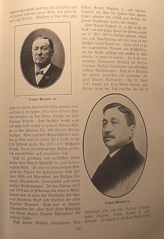 Biographies for August Bätzhold & Sons, Edward J. Frank, Francis J. Kraft, Frank A. Kraft, and J. Georg Nussbaumer ![]() August Bätzhold and Sons The firm of August Bätzhold & Sons, dealers in and importers of fine wines and spirits, is counted among the most respected and best known German established firms in the city. The founder of this firm was Mr. August Bätzhold, a self-made man in the finest sense of the term. At the age of 77 he passed over to a higher plain of existence on January 11, 1911. Mr. August Bätzhold first saw the light of the world on December 31, 1833 in Damsbrück near Langenfalza in Saxony. He apprenticed in the honorable trade of carpentry and joinery. As a youth at the age of 19 he came to the New World and settled immediately in Buffalo. After being employed in his trade for over 10 years he opened a small liquor store on Main Street in the Cold Springs District in 1863. The business grew rapidly and he was forced to find a larger facility in the building at 346 Ellicott Street. But this space also became too small so in 1872 he bought the Odd Fellows Hall at 567 - 571 Michigan Street, which he remodelled and renovated from the ground up at great expense. Mr. August Bätzhold Sr. also played a significant role in social and political life. He was a prominent member of the Order of the Free Masons, the Odd Fellows, the Elks and the Maccabees, the Buffalo Orpheus, the Sängerbund, the Gymnastics Club, and many other organizations. In 1877 and 1878 he was alderman of the old 6th Ward. Furthermore he was one of the directors of the German American Bank and director of the old Excelsior Brewery. He was also State Treasurer of the New York State Wholesale and Retail Liquor Dealers Association for many years. After his death his business was taken over by his sons, August Bätzhold Jr. and Theodor Bätzhold, who were chief assistants in the firm and helped the business to prosper for years. Mr. August Bätzhold Jr. is a chip off the old block and currently head of the firm. He was born on May 17, 1859 in Buffalo, received a good school education and then went into his father's business. Today he is considered among the most respected citizens and businessmen in the city. He's well liked and esteemed in all the circles in which he travels. He is a prominent Free Mason, a member of the Buffalo Orpheus, the Buffalo Gymnastics Club, and many other organizations. He is also a member of the local, state, and national Liquor Dealers Association. On April 26, 1911 his wife Natalie, nee Kuster, died. During their 26 year marriage the couple had 4 children: Eugenie, Jenny, August C., and Howard. Mr. Bätzhold has found August C. to be a capable assistant in the business. Caption under picture at upper left reads August Bätzhold, Sr. Caption under picture at lower left reads August Bätzhold, Jr. ![]()