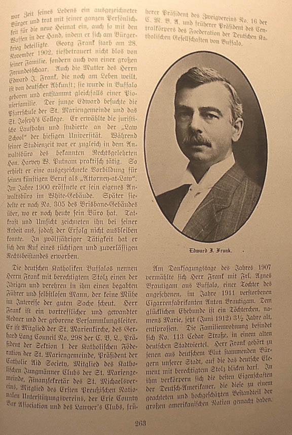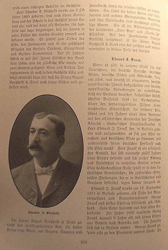 Mr. Theodor A. Bätzhold was born on October 3, 1860. After leaving school he went into his father's business and then became a travelling representative for the firm, introducing the firm and increasing the clientele base in all parts of the country. He belongs to the Order of the Elks, the Free Masons, and he is a treasured member of the Buffalo Orpheus, the Sängerbund, and the Buffalo Gymnastics Club. He married Miss Jenny Hitschler 26 years ago. The happy union has been blessed with 2 children: Alma and Arthur. The latter is employed in the family business and contributes his efforts so that the firm of August Bätzhold & Sons may prosper and flourish for a long time to come. The firm of August Bätzhold & Sons enjoys a fine reputation, procuring the best wines from the Rhineland, from Hungary, Spain, and France. They also import the finest liquor. The firm carries the best wines from California and other wine-producing regions of America and their spirits are thoroughly first class goods. They are the sole owners of the famous Deer Run and Santa Fe brands of whiskey. The firm of August Bätzhold & Sons is built on strictly honest business practices and it is one of the largest and best known firms of its kind in this part of the country. Edward J. Frank When it comes to the preservation of German identity and the proliferation of the German language, the German way of life, German customs and habits, in short everything that is German, to the high placement of the German-American ideal and to the support of German-American endeavor, the Assembly of German Catholic Societies in Buffalo stands at the foreground. Mr. Edward J. Frank has been one of the best leaders of this powerful body. He was their earlier president and for years their representative at the annual convention of German Roman Catholic State Assemblies. Mr. Edward J. Frank was born and raised in Buffalo. Much to his credit he comes from German blood and he honors his German heritage. Mr. Frank is a successful attorney who has practiced law for over 12 years now. He enjoys the popularity and respect of a wide circle of people. He has played an important role in Catholic association life, as evidenced by the many honorary positions he has held in these societies and organizations. Edward J. Frank was born on September 18, 1874 in Buffalo.He was the son of master mason and building contractor Georg Frank and his wife Elisabeth, nee Gebhard. His father came from the old fatherland. In 1839 at the age of 9 he emigrated from Bavaria to America with his parents. The family settled in Buffalo. Georg Frank is therefore one of the pioneers of our city. Caption under picture at lower left reads Theodor A. Bätzhold ![]()