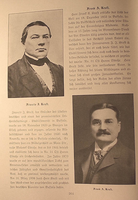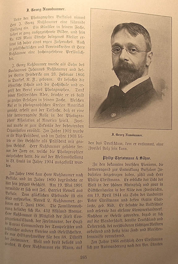 The German Catholics of Buffalo proudly claim him as one of their own. They honor him as a gifted leader and selfless man who spares no effort in the interests of the good cause. Mr. Frank is an excellent and versatile orator and a born organizational leader. He is a member of St. Mary's Church, the Gerhard Lang Council No. 298 of the C.B.L.(Catholic Benevolent League), president of Section 1 of the Catholic Federation of St. Mary's Church, president of the Catholic Aid Society, a member of the Catholic Young Men's Club of St. Mary's Church, finance secretary of the St. Michael's Club, a member of the First Prussian National Support League, the Erie County Bar Association and the Lawyers Club. He is a former president of Branch No. 16 of the C.M.B.A. (Catholic Mutual Benefit Association) and former president of the central body of the Federation of German Catholic Societies of Buffalo. On Thanksgiving Day 1907 Mr. Frank married Miss Agnes Brautigam of Buffalo. She was a daughter of the respected cigar manufacturer Anton Brautigam, who died in 1911. The happy marriage has produced one small daughter by the name of Marie who as of this date (June 1912) is 3 and a half years old. The family residence is at 113 Cedar Street in the old German quarter of the city. Mr. Frank belongs to that group of native born citizens of German heritage of whom the German population of this city may feel pride. In him the best traits of the German-American are represented. These are respected and highly valued assets which have made America a great nation. Caption under picture at upper right reads Edward J. Frank ![]() Francis J. Kraft Francis J. Kraft, founder of the oldest and most prominent German undertaking facility in Buffalo, was born on November 18, 1820 in Wangen, Alsatia, where he received his education. He apprenticed in the furniture and cabinetmaking trade. In 1840 he came to America and he settled in Buffalo. He opened a furniture business on Main Street near Mohawk, which he ran until 1844. Then he established an undertaking business at 31 East Huron Street. In 1870 he was elected Superintendent of the Poor on the Republican ticket. He executed this office with such ability and conscientiousness that he was elected a second time. On March 16, 1898 Mr. Kraft died, depriving Buffalo of one of its most respected and esteemed German pioneers. Frank A. Kraft Mr. Frank A. Kraft first saw the light of the world on December 18, 1853 in Buffalo. He attended the public school and completed his studies at the Canandaigua Academy. After being employed in the Internal Tax Service of the United States for 15 years he became a partner in his father's business. The firm was under the name of F.J. Kraft & Son. The business still operates the same way and out of the same building it has always been in at 31 East Huron Street. Like his deceased father, Mr. Kraft has the highest respect of his fellow citizens and he has a large circle of friends. He works to maintain the good reputation of the business and despite current trends the business has expanded. Caption under picture at upper left reads Francis J. Kraft Caption under picture at lower right reads Frank A. Kraft ![]() J. Georg Nussbaumer Mr. J. Georg Nussbaumer is a leading figure among the photographers of Buffalo. He is an artist in his field, producing quite excellent images. As a result his studio at 628 Main Street has a steady clientele. Mr. Nussbaumer is also a welcome personality at social and organizational functions. J. Georg Nussbaumer was the son of merchant Johannes Nussbaumer and his wife Friederike. He was born on February 23, 1866 in Dunkirk, N.Y. He attended the public school and the high school. Then he became a photographer. Thanks to his artistic ability he has had great success in his field. Proof of his reputation in photographers' circles comes from the fact that he plays an important role in the Photographers Association of America. He was elected secretary of the important organization twice. In 1902 he was its vice-president and in 1903 he successfully conducted the organization's business as president. Mr. Nussbaumer belonged to the panel which judged the photographs at the World Exposition in St. Louis in 1904. In 1886 Mr. Nussbaumer came to Buffalo and in 1890 he established his own business. On May 19, 1891 he married Miss Harriet Newell of Buffalo. One child has come from the happy union, Newell L. Nussbaumer who was born on June 7, 1896. The family home is at 432 Ashland Avenue. Mr. Nussbaumer is a member of the First Congregational Church, the Free Masons, the Hugh de Payens Commandery of the Knights of the Templar, and other groups and organizations. He was Assistant Grand Master for the 38th District of the Free Masons. Known and respected the world over, Mr. Nussbaumer is a man of German heritage in whom the German community can undoubtedly take pride. Caption under picture at upper right reads J. Georg Nussbaumer Translation for biographies of Philip Christmann & Sons will begin on Webpage 38 Susan Kriegbaum-Hanks