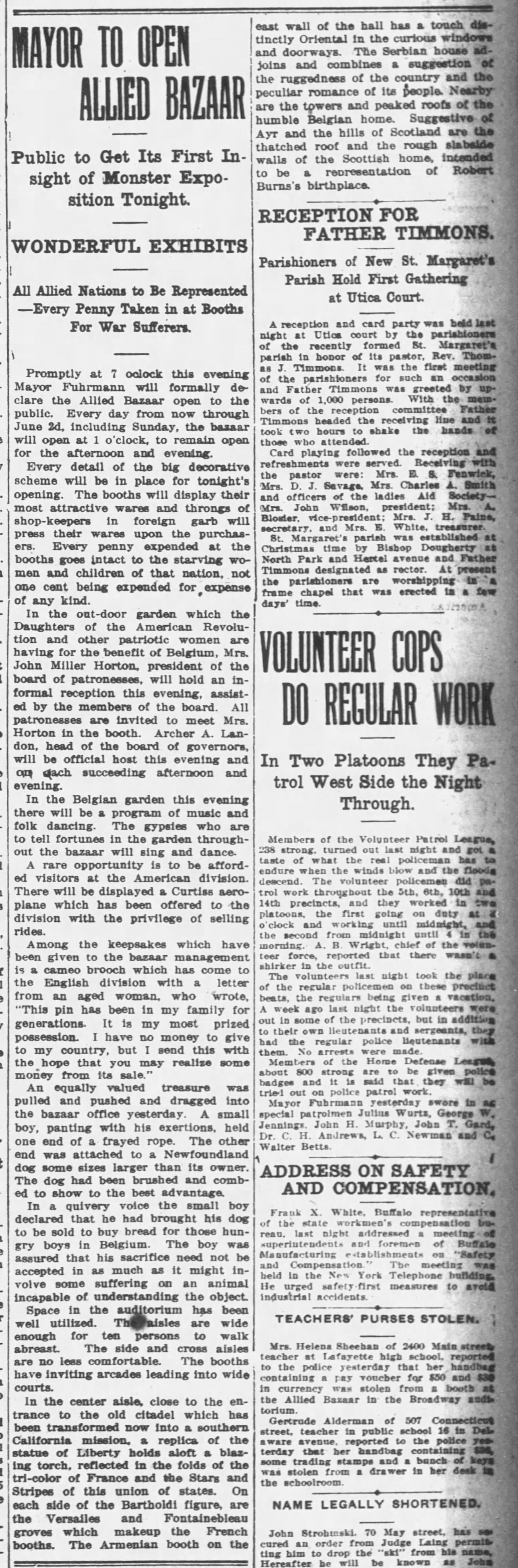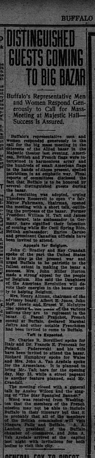 | Distinguished Guests Coming to Big Bazar_____ Buffalo's Representative Men and Women Respond Generously to Call for Mass Meeting at Majestic Hall -- Success is Assured. _____ Buffalo's representative men and women responded generously to the call for the big mass meeting in the interests of the Allied bazar in the Majestic theater last evening. American, British and French flags were intertwined in harmonious array and the hundreds of small American flags in the hands of those present spelled patriotism in an emphatic way. Final reports of committees discussed the fact that Buffalo is to be honored by several distinguished guests during the bazar. The resolution was adopted, urging Theodore Roosevelt to open the fair. Mayor Fuhrmann, chairman, opened the meeting with a short talk, outlining the purposes of the bazar. Former Presient William H. Taft and James W. Gerald, late ambassador to Germany, have signified their intention of coming while Sir Cecil Spring Rice, British ambassador; Enrico Caruso and prominent Canadian officials have been invited to attend. John C. Bradley and Ray Crandall spoke of the part the United States is to play in the present war and urged Buffalo to be patriotic to the fullest extent in making the bazar a success. Mrs. John Miller Horton made a strong appeal for the people of Belgium. She said the Daughters of the American Revolution will devote their energies in the bazar mostly to helping Belgium. Mrs. Henry Altman, chairman of the advisory board; Albert M. Jones, John McF. Howie and Ernest W. McIntyre also spoke to the people of the various nations they are to represent in the bazar. C. Pascal Franchot, French consul at Buffalo, declared Marshal Joffre and other notable Frenchmen had been invited to come to Buffalo. Dr. Charles R. Borzillieri spoke for Italy and Dr. Francis E. Fronczak for Poland. Paderewski and his wife have been invited to attend the bazar. Richard Humphrey spoke for Wales and Mrs. John A. Van Arsdale spoke for the Armenians. It is planned to bring Mr. Taft here for the opening day, May 23, while the street pageant is another feature planned, said Mrs. Crandall. The meeting closed with a general talk by Ansley Wilcox and the singing of "The Star Spangled Banner." Word was received from Washington that the members of the French mission may not be able to include Buffalo in their itinerary but that it is propably that all the members for the British commission will visit Niagara Falls and Buffalo. A.A. Landon, president of the Buffalo chamber of commerce, and John A. Van Arsdale arrived at the capitol last night with invitations for both bodies to visit this city. |