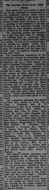 | Miss Maria M. Love called a meeting of the chairmen of committees in the American section, Allied bazar, yesterday morning at the Hotel Genesee. The American section had received as a gift from Mrs. John W. Derrigan of Orchard Park a crocheted bedspread, which it has taken two years to make. In lieu of the personal service during the bazar which Mrs. Derrigan is not able to give, she has sent the bedspread with the hope that $150 may be realized through it for the Red Cross. The needlework committee of the American section is presenting many novelties, but the most novel of all its displays will be a Chow puppy, the gift of Sheldon Thompson. Yesterday Mrs. Mai Davis Smith, chairman of the booth, was given a complete layette for a baby. In view of the need for money in other directions Mrs. Smith and her committee will offer no article for sale which has not a distinct use. The women of the booth are meeting once a week to make articles and in addition gifts have been promised from the shops, hats, gowns, blouses, negligees, frocks for little girls and many other beautful things. Three old fashioned Sheffield platter covers have been given to the booth. The committee assisting Mrs. Smith includes Mrs. James H. Dyett, Mrs. Allan L. Holloway, Mrs. M.C. Bartholomew, Mrs. E.M. Husted, Mrs. John C. Quintus, Mrs. Oliver A. Jenkins, Mrs. Alice H. Clark, Miss Clara M. Diehl, Miss Susanna McDougall, Miss Isabel Duncan, Miss Cecelia Plummer, Miss Rose Marcus, Miss Alice J. Thompson, Miss DeForest, Miss Jessup, Mrs. Frank H. Ransom, Mrs. George B. Webster, Mrs. Frederick L. Truscott, Mrs. Charles M. Clarke, Mrs. Ernest Montgomery, Mrs. Josephine Dodman, Mrs. Avery C. Wolfe, Mrs. Edward L. Kleinhans, Mrs. F.H. Underwood, Mrs. Sheldon Thompson, Mrs. Grosvenor Gowans, Mrs. Douglas Cornell, Mrs. E.S. Warren, Mrs. E.A. McLeod, Mrs. Henry L. Brown, Mrs. A.H. Alberger, Mrs. George F. Hulen, Mrs. Oliver Allen, Mrs. Albert S. Fenton. Mrs. Henry Altman, chairman, and the members of the advisory board, has arranged the rally this afternoon at 3 o'clock in Elmwood Music Hall, to which all school children of the city are invited. George D. Emerson will preside. There will be a patriotic talk by Peter A. Porter, the bugle call and raising of the American and Red Cross flags. Parents as well as children are invited. A subscription dance will be given for the Italian art booth next Monday evening by the teams headed by Mrs. Charles R. Borzillieri, chairman of the art booth. |