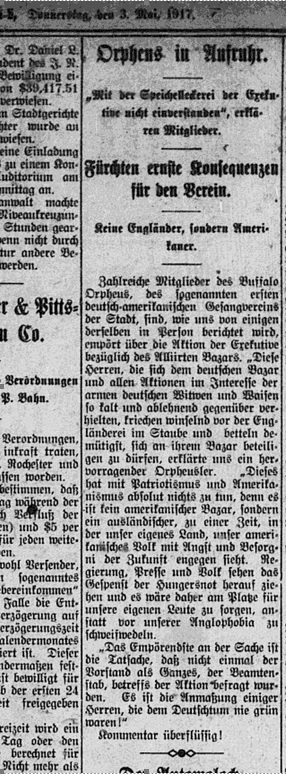 The Orpheus in an uproar. Members declare themselves “not in agreement with the ingratiating tactics of the Executive Committee” _____ Fear of Serious Consequences for the Society _____ Not for the English but for the Americans. Numerous members of the Buffalo Orpheus, the so-called first German-American singing society of the city, is, as has been reported to us in person by a member of that society, upset by the actions of the executive committee with regard to the Allied Bazaar. “These gentlemen, who coldly rejected the German Bazaar and its activities in the interest of poor German widows and orphans, now crawl on their knees and humbly beg they be allowed to participate in the bazaar lending aid to the people of England.” The above mentioned member of the Orpheus further stated, “This has absolutely nothing to do with patriotism and Americanism since its not an American bazaar but one dedicated to foreigners at a time in which in our own country our American people are faced with fear and anxiety for the future. The government, the press, and the American people see the specter of famine draw near and it should be our task to take care of our own people instead of waging our tails in the service of our concerns for the British. “The most frustrating aspect of this issue is the fact that not once did the executive board meet as a whole and the staff officers were not consulted. This was a measure taken by a few men who were never truly dedicated to the German people!” Further comment is not necessary! |