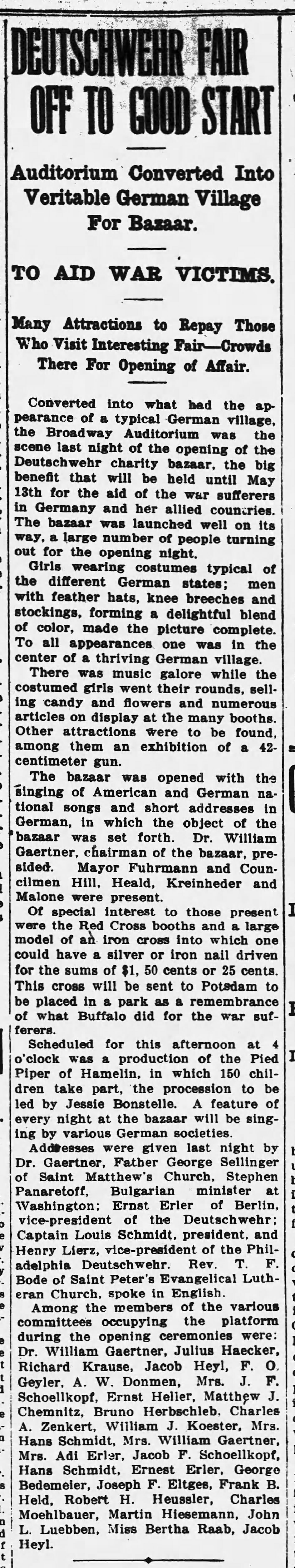 Deutschwehr [German Defense] Fair off to Good Start _____ Auditorium Converted Into Veritable German Village For Bazaar _____ To Aid War Victims _____ Many Attractions to Repay Those Who Visit Interesting Fair — Crowds There For Opening of Affair. _____ Converted into what had the appearance of a typical German village, the Broadway Auditorium was the scene last night of the opening of the Deutschwehr charity bazaar, the big benefit that will be held until May 13th for the aid of the war sufferers in Germany and her allied countries. The bazaar was launched well on its way, a large number of people turning out for the opening night. Girls wearing costumes typical of the different German states: men with feather hats, knee breeches and stockings, forming a delightful blend of color, made the picture complete. To all appearances one was in the center of a thriving German village. There was music galore while the costumed girls went their rounds, selling candy and flowers and numerous articles on display at the many booths. Other attractions were to be found, among them an exhibit of a 42-centimeter gun. The bazaar opened with the singing of American and German national songs and short addresses in German, in which the object of the bazaar was set forth. Dr. William Gaertner, chairman of the bazaar, presided. Mayor Fuhrmann and Councilmen Hill, Heald, Kreinheder and Malone were present. Of special interest to those present were the Red Cross booths and a large model of an iron cross into which one could have a silver or iron nail driven for the sums of $1, 50 cents or 25 cents. This cross will be sent to Potsdam to be placed in a park as a remembrance of what Buffalo did for the war sufferers. Scheduled for the afternoon at 4 o'clock was a production of the Pied Piper of Hamelin, in which 150 children take part, the procession to be led by Jessie Bonstelle. A feature of every night at the bazaar will be singing by various German societies. Addresses were given last night by Dr. Gaertner, Father George Sellinger of Saint Matthew's Church, Stephen Panaretoff, Bulgarian minister at Washington; Ernst Erler of Berlin, vice-president of the Deutschwehr; Captain Louis Schmidt, president, and Henry Lierz, vice-president of the Philadelphia Deutschwehr. Rev. T.F. Bode of Saint Peter's Evangelical Lutheran Church, spoke in English. Among ther members of the various committees occupying the platform during the opening ceremonies were: Dr. William Gaertner, Julius Haecker, Richard Krause, Jacob Heyl, F.O. Geyler, A.W. Donmen, Mrs. J.F. Schoellkopf, Ernst Heller, Matthew J. Chemnitz, Bruno Herbschleb, Charles A. Zenkert, William J. Koester, Mrs. Hans Schmidt, Mrs. William Gaertner, Mrs. Adi Erler, Jacob F. Schoellkopf, Hans Schmidt,, Ernest Erler, George Bedemeier, Joseph F. Eltges, Frank B. Held, Robert H. Heussler, Charles Moehlbauer, Martin Hiesemann, John L. Luebben, Miss Bertha Raab, Jacob Heyl. |