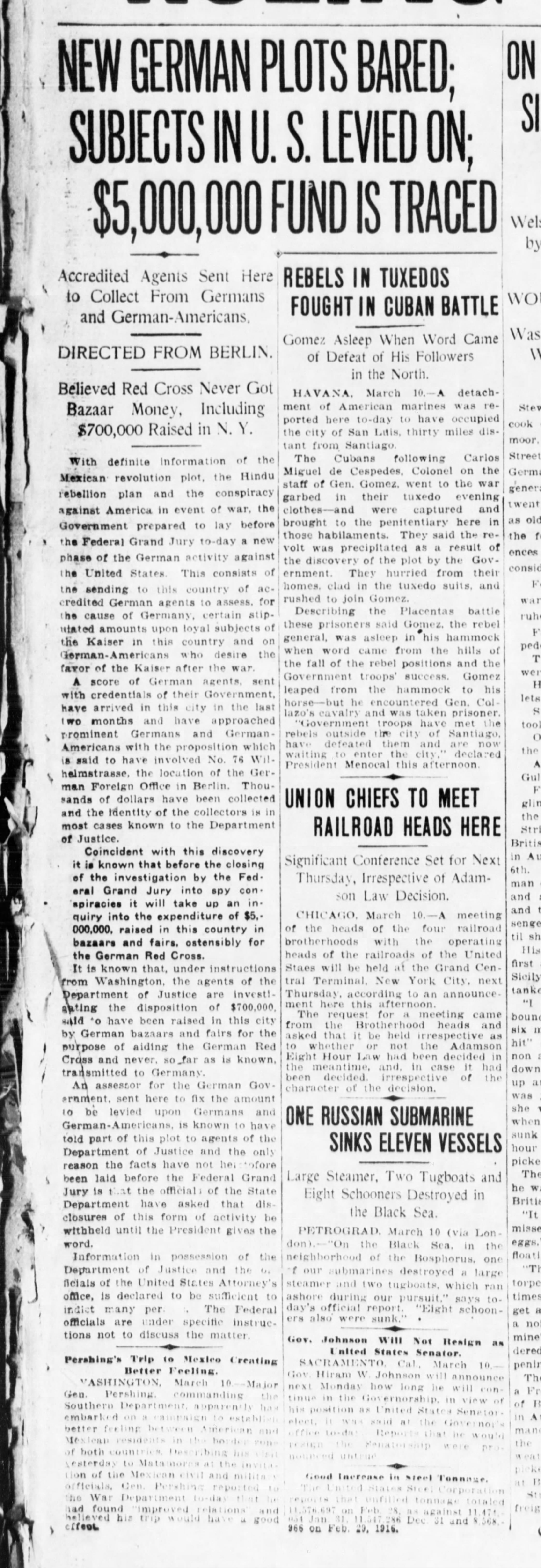 _____ Accredited Agents Sent Here to Collection From Germans and German-Americans _____ DIRECTED FROM BERLIN _____ Believed Red Cross Never Got Bazaar Money, Including $700,000 Raised in N.Y. With definite information of the Mexican revolution plot, the Hindu rebellion plan and the conspiracy against America in event of war, the Government prepared to lay before the Federal Grand Jury to-day a new phase of German activity against the United States. This consists of the sending to this country of accredited German agents to assess, for the cause of Germany, certain stipulated amounts upon loyal subjects of the Kaiser in this country and on German-Americans who desire the favor of the Kaiser after the war. A score of German agents, sent with credentials of their Government, have arrived in this city in the last two months and have approached prominent Germans and German-Americans with the proposition which is said to have involved No. 76 Wilhelmstrasse, the location of the German Foreign Office in Berlin. Thousands of dollars have been collected and the identity of the collectors is in most cases known to the Department of Justice. Coincident with this discovery it is known that before the closing of the investigation by the Federal Grand Jury into spy conspiracies it will take up an inquiry into the expenditure of $5,000,000 raised in this county in bazaars and fairs ostensibly for the German Red Cross. It is known that, under instructions from Washington, the agents of the Department of Justice are investigating the disposition of $700,000 said to have been raised in this city by German bazaars and fairs for the purpose of aiding the German Red Cross and never, so far as is known, transmitted to Germany. An assessor for the German Government, sent here to fix the amount to be levied upon Germans and German-Americans, is known to have told part of this plot to agents of the Department of Justice and the only reason that facts have not heretofore been laid before the Federal Grand Jury is that the officials of the State Department have asked that disclosures of this form of activity be withheld until the President gives the word. The information in possession of the Department of Justice and the officials of the United States Attorney's Office, is declared to be sufficient to indict many persons. The Federal officials are under special instructions not to discuss the matter. |