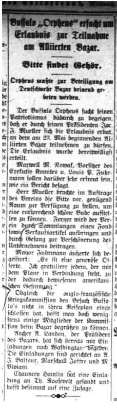 The Orpheus had to beg to take part in the German Defense Bazaar _____ Maxwell M. Nowak, chairman of the executive committee, and Louis Fuhrmann are reported to be very pleased by the request. Acting for the society Mr. Mueller requested sufficient room be placed at its disposal for a beautiful booth. Furthermore the society will contribute to the enterprise by taking up a collection, providing various articles for sale, and performing songs to enhance the event. Mayor Fuhrmann expressed his delight: It is a generous offer. I congratulate those who are aligned with this plan to prove their American sympathies. Although the Anglo-French War Commission has decided not to include a visit to Buffalo in its travel plans, it is hoped that at least a few members of the Commission will be greeted at the bazaar. Archer A. Landon, the president of the bazaar, has already sent invitations to Washington. A.J. Balfour, Marshal Joffre, and M. Viviani have also received invitations. Chauncey Hamlin has sent an invitation to Theodore Roosevelt and has high hopes that he will attend. |
