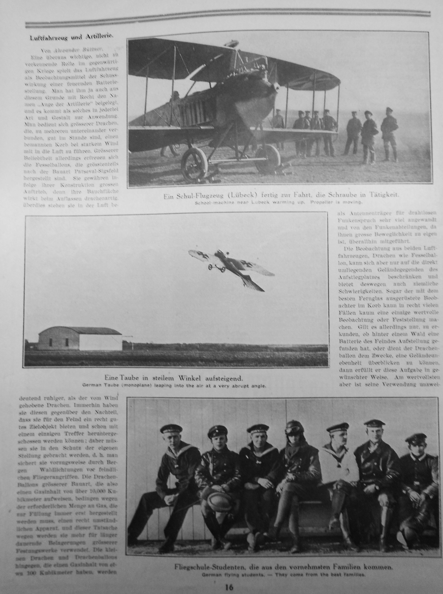 Airships and Artillery By Alexander Büttner. Airships play an important the current war and they should not be overlooked as a means of observing weaponry positions. For this well-deserved reason airships have been called "The eyes of the artillery unit." They come in all shapes and sizes for use in a multitude of applications. The military uses large kite balloons, many of which are bound together with manned baskets underneath. These use strong winds to propel them through the air. Stationary balloons designed by Parseval and Sigsfeld have even greater popularity. Due to their construction they have greater bouyancy because they have tails constructed to funnel headwinds. However they also have the disadvantage of becoming good targets for the enemy and easy to shoot down. Consequently they must be placed preferrably in mountainous forest clearings protected from enemy attacks. Larger kite balloons have a gas capacity of 10,000 cubic meters. This is an enormous amount of gas which must often be replenished by a complicated apparatus requiring lengthy periods of tethering. Smaller kites and kite balloons contained about 100 cubic meters of gas. They carry antennas, which enable wireless radio communication, and mobile radio compartments. Any communications concerning observations made from both types of air vehicles, kites and stationary balloons, are limited to direct contact with areas around the liftoff platforms and thus create certain difficulties. Even with the best binoculars in many cases it's hard to make reliable observations or determinations from the basket. Mostly they are used to determine if a battery of enemy soldiers has found a foothold behind a wooded area. In other cases kite balloons allow an overview of the terrain in order to determine unevenness. However it's most advantageous use is Caption under photograph at top: A Student Aircraft (in Lübeck) ready for takeoff; the propeller in motion. Caption of photograph at center: A Taube (monoplane) climbing at a steep angle. Caption of photograph at bottom: Flight School Students who come from the Best Families. |