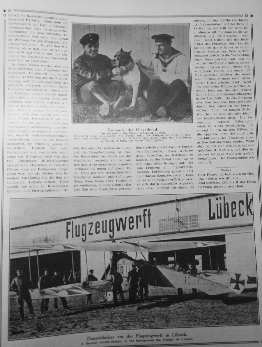 Caption of photograph at top: Bismark the Flying Dog. Bismark flies like all the other young chaps; he wears a flying jacket and protective goggles. He brings luck -- none of the machines in which he has flown has had an accident. Caption of photograph at bottom: Double Decker in front of the airplane factory in Lübeck. |