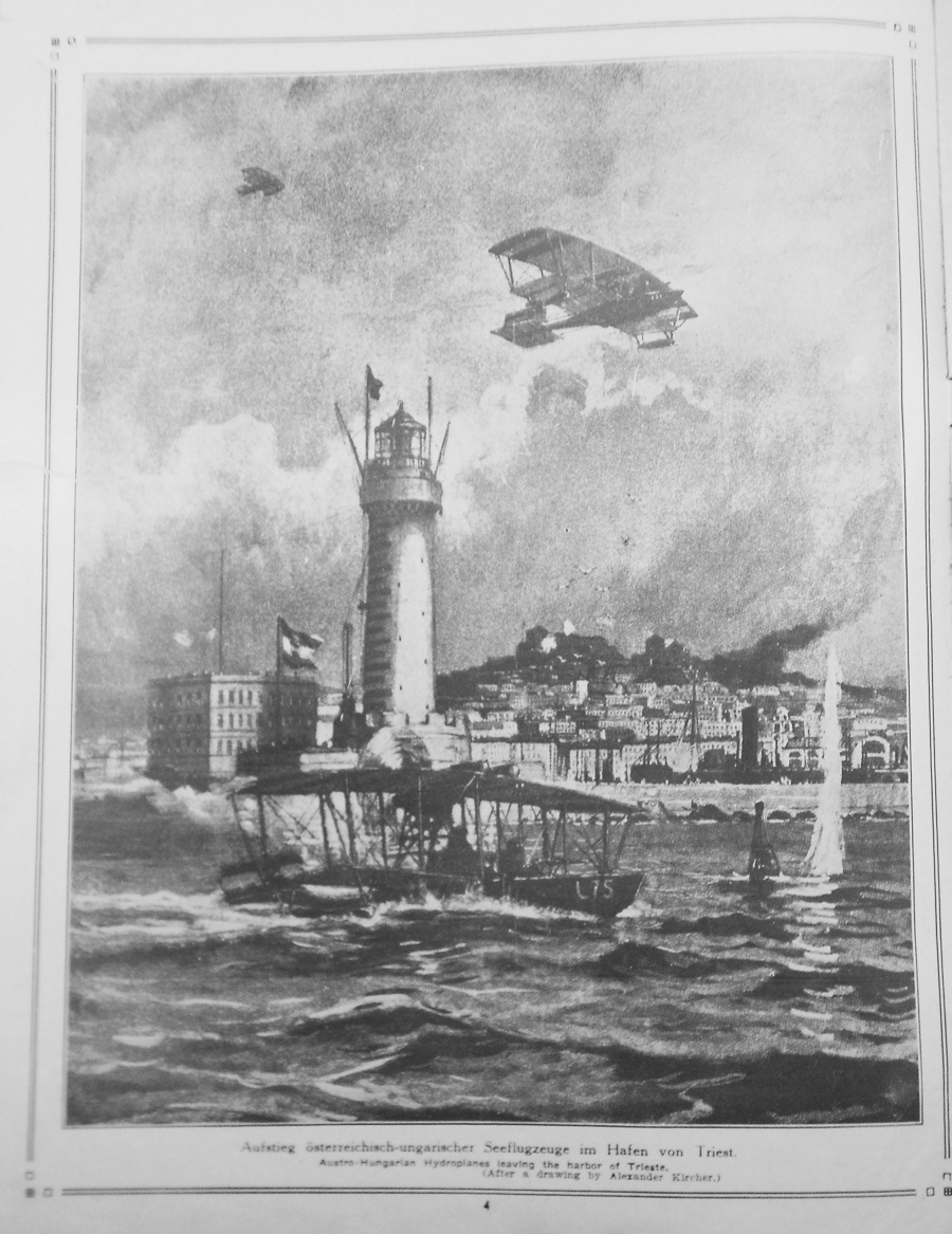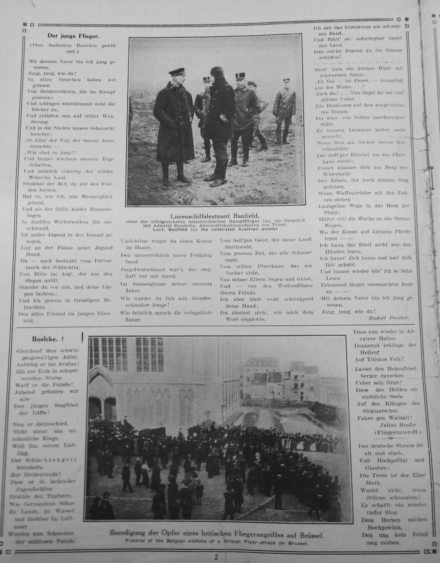 Caption under photograph at top: Naval Lieutenant Banfield, one the the most successful battle pilots in conversation with Admiral Koudelka, regional commander of Triest. English text reads Leut. Banfield, the celebrated Austrian aviator. Caption under photograph at bottom: Funeral for the victims of a British Air Raid in Brussels. |
