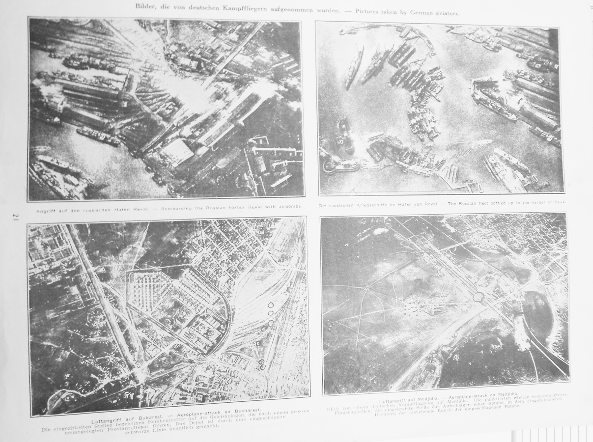 Caption at top of page: Pictures taken by German battle pilots. Caption under photograph at top left: Attack on the Russian harbor at Reval Caption under photograph at top right: The Russian battleships in the harbor at Reval Caption under photograph at bottom left: Air attack on Bucharest. The circled locations indicate where bombs fell on the train tracks leading to a large, newly developed provisional depot. The depot is identified by a sharply defined black line. Caption under photograph at bottom left: Air attack on Medjidia. View from a German fighter plane over Medjidia. The pinpointed location indicates a large airport. The circled location indicates where a bomb hit. In the right corner there's smoke from exploded bombs. |
