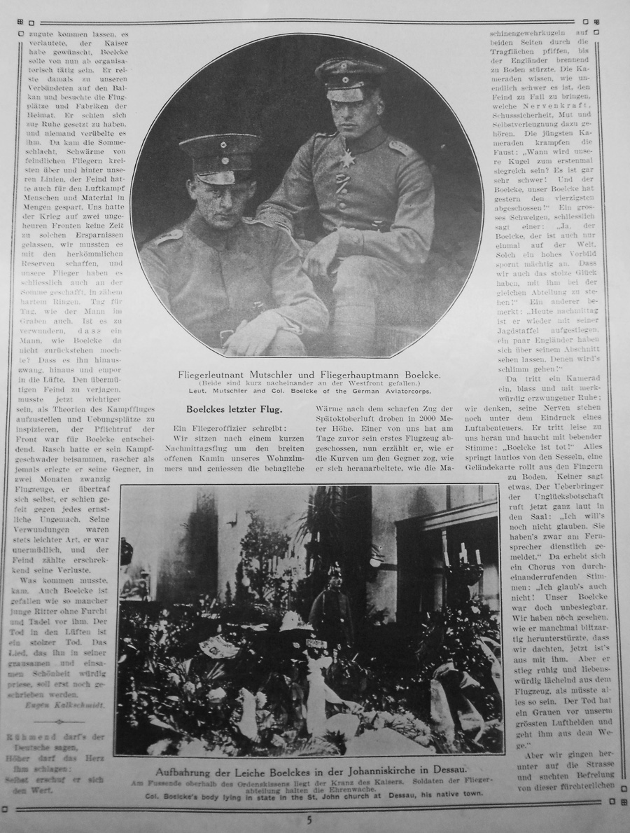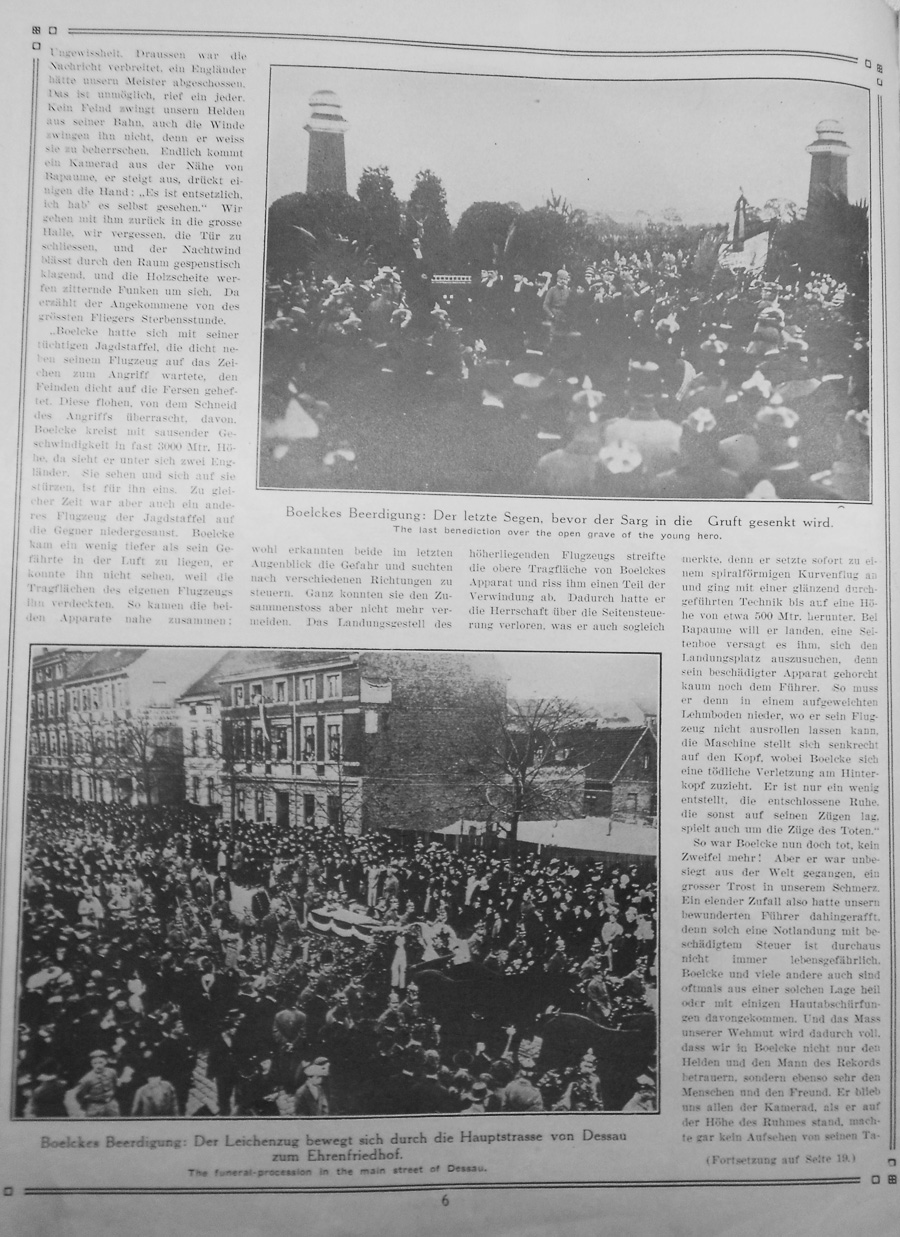 The news had spread that an Englishman may have shot down our master aviator. That's not possible, someone said. No enemy can force our hero from this course. Even the wind cannot force him because he knows how to control it. Finally a comrade came from the environs of Bapaume. He climbed out of his plane, shook a few people's hands and stated, "It's terrible, I saw it myself." We took him back with us to the large hall. We forgot to close the door and the night wind blasted through the room with a ghostly rattle. Sparks flew from the wood on the fire. Here the new arrival told us about the greatest aviator's final hour. "Boelcke was with his capable fighter squadron waiting for the signal to attack. They went off in swift pursuit of the enemy. Surprised, the enemy broke off the attack and fled. With increased acceleration Boelcke circled at an altitude of about 3000 meters. There were two English planes beneath him. He dove down. At the same time there was another squadron airplane soaring down on the enemy. Boelcke flew a little lower than his companion and didn't see him because the wings of his plane obscured the view. Both planes came close together, only at the last moment recognizing the danger. They attempted to change course but they couldn't quite avoid the collision. The landing gear on the higher plane scrapped Boelcke's wing and tore off part of it. He lost control of the steering mechanism and immediately went into a spiral descent down to an altitude of about 500 meters. At Bapaume he tried to land but a crosswind kept him from finding a place to land. His damaged plane no longer obeyed its pilot. He had to go down in a dirt clearing where his wheels couldn't roll. The machine flipped over and Boelcke sustained fatal injury to the back of his head. He's only slightly disfigured. The peaceful look on his face was the same as that of every other dead person." So Boelcke was dead. No more doubt! But he left the world undefeated. This was a comfort to us in our pain. A miserable acciedent had cut down our awesome leader. An emergency landing with damaged steering is not always life-threatening. Boelcke and many others often come out of such situations undamaged of with only a few scrapes. The measure of our sadness was so great because not only was Boelcke a hero and a man who set records. He was also a fine man and our friend. To us all he remains a comrade standing at the peak of glory. The accident in no way detracts from his talent. (continued on p.19) [Translator's note: page 19 not imaged.] Caption under photograph at top: Boelcke's interment - The final blessing before lowering the coffin into the grave. Caption under photograph at bottom: Boelcke's Burial - The funeral procession through the main street of Dessau to the cemetery. |
