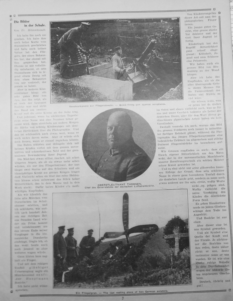 By Fr. Hildenbrandt. I hadn't seen him before. I never saw a card with his name on it at the guest table, and I don't have a cousin among the aviators who had an acquaintance who had ever spoken to him. And I'm totally ignorant of whether his family tree has any branch connected with an acquaintance of mine. However in my classroom hangs a picture of him. It's a good picture which portrays him when he was Lieutenant Boelcke without the band on his second button and the first class medal on the side. And each time when a daily report showed his name and his higher number the eyes of forty children looked with affection towards his photograph. In the end is it worth anything if he didn't know about it? But he would have been pleased if he had seen it even once. The boys push past and jostle their heads with unhidden and limitless envy and the boundless wondrament of youth. The girls are somewhat quieter and quicker with intelligent eyes which seem to see more than the mere flight lieutenant with two stars on his shoulders and a blue corner cross on his collar. Perhaps they see beyond the basic heroics into the unconscious bit of chivalry in the man and his work. Children had a remarkable instinct about this. As we recently heard the beloved old fairytale of Sleeping Beauty in the classroom. I questioned whether after a hundred years the time had finally come for a prince who was untroubled by the bitter end of previous men attempting to cross the thorny path. I asked if today there would be anyone daring to try? A tentative finger raised up from behind. In the steady voice of one totally convinced a girl softly said, "Captain Boelcke." I did not contradict her. One should refrain from raising a pedagogical finger against such form of childhood gospel. A youthful and honest face, a tremendously strong deed behind it, thus the god of youth is set. Childhood logic creates sharp limits on the notion of chivalry: boldness whereby a young man recues a princess. We also have a large picture of Hindenburg hanging on the wall. But I get the feeling that the overbearing greatness of this man is too much for the mental capacities of boys and girls. They know what he did over there on the eastern front and even sense what he means to us and to our history as leader of the German army but they have no understanding of the actual value of his utterly enormous work. Thus I understand why the picture of the great field general maintains its untouched color purity while the photograph of the young flight captain shows signs of dullness with the smudges of several dozen fingerprints. We grownups sense it too. The wisp of chivarly swirling around the man as he acquires mastery over the unromantic machinery of destruction. His dazzling successes aren't the only reason why the mere mention of his name resounds with a particular clarity throughout the German countryside. There's something else about him that defies description. Perhaps its purest form of acknowledgement comes from the naive adoration of children. The bell tolls a hundred thousand times for the dead and Boelcke is but one of them. However for us he has become a symbol, a source of strength and joy. The more somber the talk about him, the more he sustains us and the more he becomes intimate to us. He is like a strong and peaceful melody amid the pervasive discord of horrible events. German, brave. and good. Caption under photograph at top: Revolver canon for defense against aircraft. Caption under photograph at center: Lieutenant-Colonel Thomsen, chief of staff of the German Air Force Caption under photograph at bottom: A pilot's grave - The last restng place of two German aviators. |