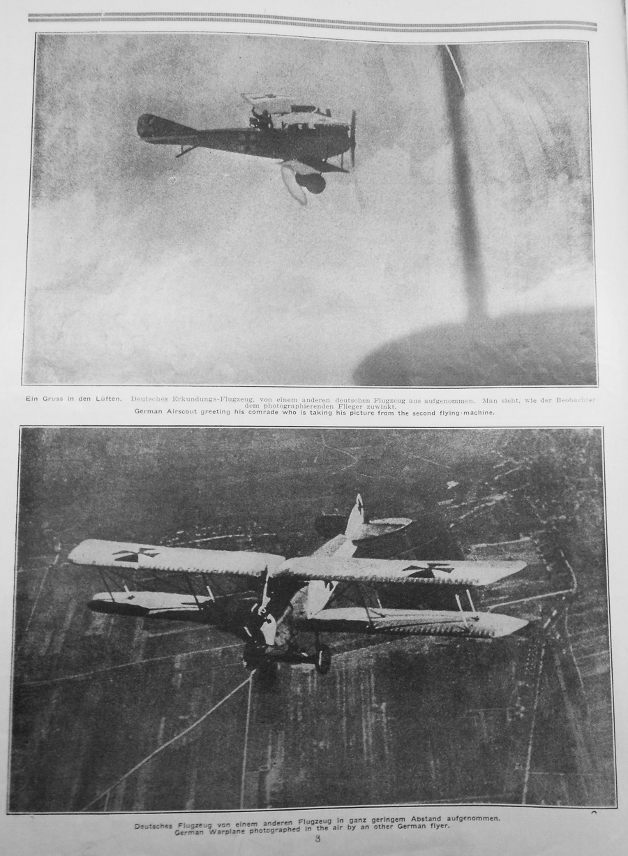 Caption under photograph at top: Greetings in the air. A German reconnaissance plane photographed by another German airplane. One sees how the observer waves to the photographing plane. Caption under photograph at bottom: A German airplane takes a picture of another plane from a very close distance. |
