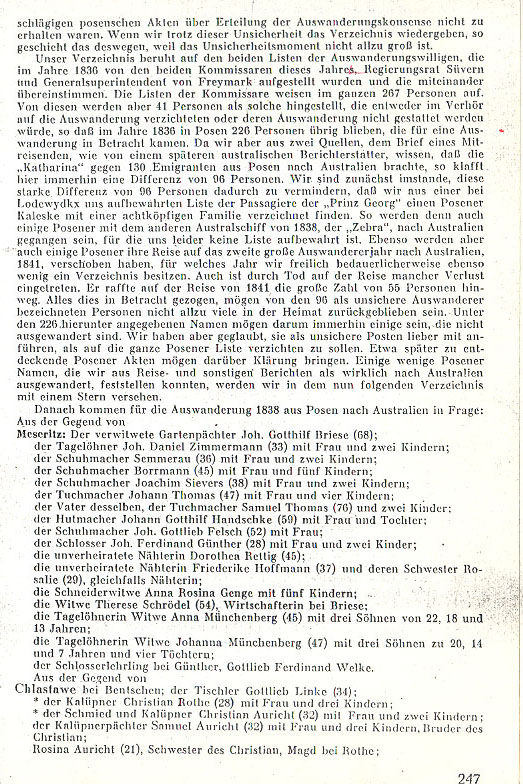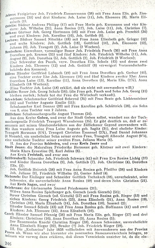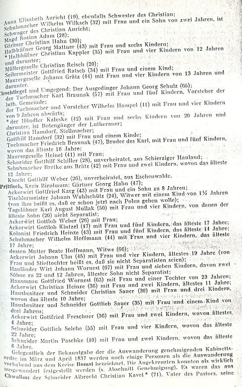 his wife * and three children: Joh. Ferdinand Wilhelm * (34), Friedrich Daniel Samuel and Maria Charlotte Sabine *, who in Australia married the widower and gamekeeper Fiedler. Karge: Julius Fiedler *, son of master combsetter Samuel Fiedler. Borul: Anna Elisabeth Schmidt (36) with daughter Joh. Anna (2); lodger Dorothea Fitzner (43) with son Gottlieb (9) and two daughters aged 17 and 8 years; Johann Geog Jäschke * from Scharker Hauland. Total number of emigrants: