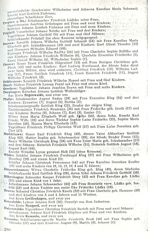 Total Persons:690 The entire group of Lutheran emigrants for the year 1839 went to America. I. Emigrating from Pomerania, Wollin District in or near Schwantus: sheepfarmer Heckendorf (48) with wife, neé Ehlke (41) and eleven children: Christian Friedrich Wilhelm (21), Karl Friedrich August (20), David Heinrich Wilhelm (14), Johann Gottlieb (9), Wilhelm Friedrich (3), Franz Ferdinand (1), Ernestine Charlotte Wilhelmine (17), Friderike Luise Maria (16), Fridericke Luise Henriette (12), Sophie Maria Elisabeth (7), Johanna Ernestine (5); daily wage earner Friedrich Wilhelm Finck (29) with wife Friderike Luise Henriette, neé Schmidt (26) and son Karl Friedrich Wilhelm (1); lodger Hinz (35) with wife and four children: Karoline Sophie Friderike (9), Ernestine Albertine Wilhelmine (7), Wilhelmine Friderike (4), Albertine Auguste Maria (2); stallkeeper Karl Philipp Ludwig Milbrath (28) with wife Karoline Friderike Wilhelmine, neé Hoeckendorf (23) and daughter Hanna Wilhelmine Froderike (2); stallkeeper Schmidt (51) with wife, neé Götzke (54), son Friedrich Wilhelm (23) and daughters Friderike (25), Wilhelmine Sophie Friderike (17). Wartlow: daily wage earner Ernst Karl Friedrich Finck (32) with wife Dorothea Elisabeth, neé Hoeft (35) and two children: Hanna Karoline (3), Friderike Wilhelmine Karoline (2); shepherd August Friedrich Samuel Trappe (47) with wife Dorothea Sophia, neé Krause and stepdaughter Maria Krause (22) and adopted son Martin Gottfried Krüger (19). Warnow: stallkeeper Erdmann Friedrich Ackermann (41) with wife and three children: August Friedrich Wilhelm (13), Johann Wilhelm (7) and a daughter; unmarried worker Wilhelmine Krause (25). Fernownsfelde: landowner Johann Krüger (37) with wife (36) and four children: Dorothea Frid. Albertine (14), Charlotte Maria Karoline (11), Johann Wilhelm (9), a daughter of ½ year; landowner Peter Wilde (66) with wife and three children: Joachim Wilhelm (26), Johann Gottlieb (24), Michael Friedrich (20). Kolzow: tailor Franz Wilhelm Lemke (48) with wife Christine Charlotte, neé Zühlcke (43) and son August Friedrich Wilhelm (19); farmer Martin Friedrich Schössow (47) with wife and three children: Michael Friedrich Wilhelm (18), Johann Karl Friedrich (12), Wilhelmine (16). Coesenthin: landowner Karl Friedrich Parlow. Vietziger Ablage; shoemaker Joahnn Christian Bachmann (41) with wife and three children: Johanna Albertine Sophie (13), August Friedrich (3), Ferdinand Christian (3). From Greifenberg District in or near Schwessow: cottager Johann Knuth and wife and five children; old shareholder Gottfried Knuth and Ernst Ludwig Gottfried Knuth; workman Johann Gottlich Pagenkopf with wife and two children; resident Johann Roggenbuck with wife and five children; wheelwright Friedrich Hartwig with wife and six children; wheelwright August Riehe with wife and one child; |