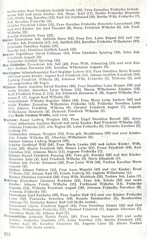 Ornshagen: master blacksmith Karl Bogislav Lettow (44), Mrs. Dorothea Maria Krause (36) and six children:August Karl Friedrich (13), Johann Gottlieb Friedrich (10), Ludwig Friedrich Wilhelm (8), Johanna Wilh. Friderike (4), Wilhelm (2), and one child unbaptised (26 days).