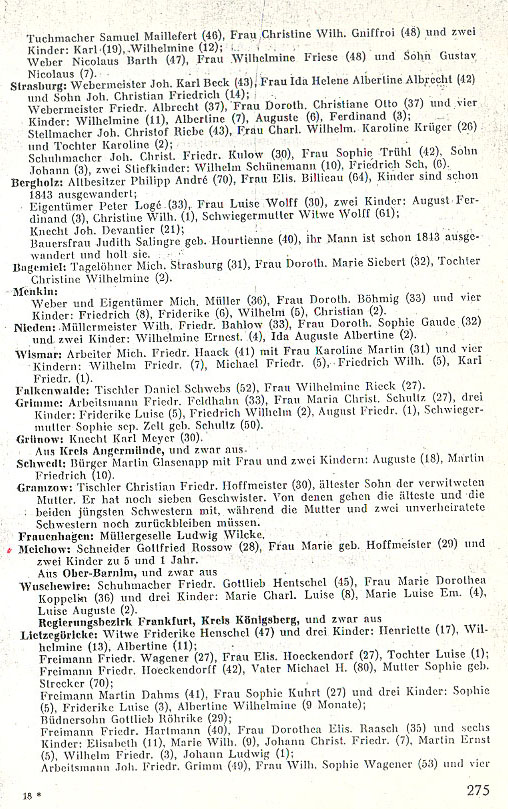 resident Karl Kuckahn (38), Mrs. Sophie Hass [Haß] (41) and four children: Friderike Luise (12), Franziska Dorothea (10), Rosalie Bernhardine (5), Bernhardine Johanne (1), stepson Robert Hass (16) remained behind; resident Christ. Friedrich Eggert (42), Mrs. Dorothea Ehmke (35) and five children: Wilhelmine Friderike (11), Christof Friedrich (7), Auguste Albertine (5), Dorothea Marie (3), Johann Karl (1).