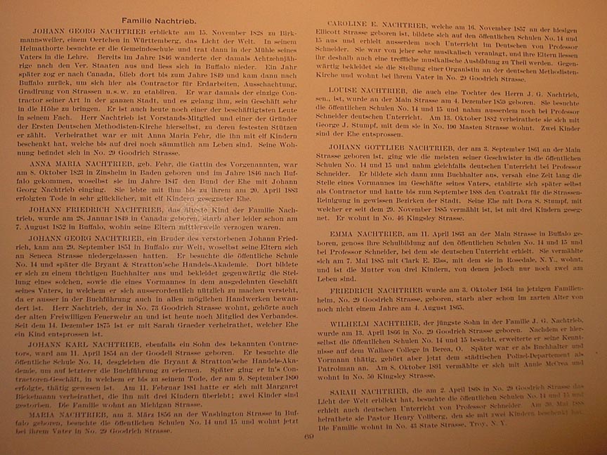Anna Maria Nachtrieb, nee Fehr, wife of the above mentioned, was born on October 8, 1823 in Zinsheim, Baden. She came to Buffalo in 1846. She entered the bonds of holy matrimony with Johann Georg Nachtrieb in 1847. She lived with him in wedded bliss until her death on April 20, 1883. The marriage was blessed with 11 children. Johann Friedrich Nachtrieb, eldest child of the Nachtrieb family, was born in Canada on January 28, 1849 but unfortunately died on August 7, 1852 in Buffalo while his parents were moving. Johann Georg Nachtrieb, brother of the late Johann Friedrich, came into the world on September 29, 1851. He was born in Buffalo. His parents had settled on Seneca Street. He attended Public School 14 and later Bryant and Stratton Business Academy. There he studied accounting , the profession which he practices currently. He's also a foreman in his father's flourishing business, in which he knows how to make himself exceptionally useful. Besides bookkeeping he's involved in just about every kind of trade activity. Mr. Nachtrieb, who lives at 73 Goodrich Street, belongs to the Volunteer Fire Department and is currently a member of the union. He's been married to Sarah Graeder since December 14, 1875. The marriage has produced one child. Johann Karl Nachtrieb, a son of the well known contractor, was born on April 11, 1854 on Goodell Street. He attended Public School 14 and Bryant and Stratton Business Academy to learn accounting. He later went into the contracting business, in which he was successfully active until his death on Spetember 9, 1890. He was married to Margaret Bickelmann in February 11, 1881, who survived him along with 3 children. Two other children are dead. The family lives on Michigan Avenue. Maria Nachtrieb was born on Washington Street in Buffalo on March 3, 1856. She attended Public Schools 14 and 15 and lives now with her father at 29 Goodrich Street. Caroline E. Nachtrieb, who was born on November 16, 1857 on Ellicott Street, was educated at Public Schools 14 and 15. She also took instruction in German from Professor Schneider. She was musically gifted and her parents allowed her to receive an excellent musical education. Currently she is organist of the German Methodist Church. She lives with her father at 29 Goodrich Street. Louise Nachtrieb, another daughter of Mr. J. G. Nachtrieb, was born on Main Street on December 4, 1859. She attended Public Schools 14 and 15 and took German instruction under Professor Schneider. On October 13, 1882 she married George J. Stumpf, with whom she lives at 190 Masten Street. Two children have come from the marriage. Johann Gottlieb Nachtrieb, born on September 3, 1861 on Main Street, went to Schools 14 and 15 like his siblings and also took German instruction from Professor Schneider. He educated himself to become an accountant, worked for a time as a foreman at his father's business, then established himself as a contractor. Until September 1888 he had all the contracts for street cleaning in certain sections of the city. His marriage to Dora S. Stumpf, since November 29, 1885, has been blessed with 3 children. He lives at 46 Kingsley Street. Emma Nachtrieb, born on April 11, 1863 on Main Street, received her education at Public Schools 14 and 15 and with Professor Schneider, from whom she took German instruction. On May 7, 1885 she married Clark E. Eiss, with whom she lives in Rosedale, N.Y. She is the mother of 3 children, of whom 2 are still living. Friedrich Nachtrieb was born on October 3, 1864 at what is now the family home at 29 Goodrich Street. Unfortunately he died at a tender age of not even one year on August 4, 1865. Wilhelm Nachtrieb, youngest son of the family of J.G. Nachtrieb, was born on April 13, 1866 at 29 Goodrich Street. After attending Schools 14 and 15 he furthered his education attending Wallace College in Berea, Ohio. He was later employed as an accountant and foreman, but now belongs to the city Police Department as a patrolman. On October 8, 1891 he married Annie McCrea. He lives at 50 Kingsley Street. Sarah Nachtrieb, who first saw the light of the world on April 2, 1868 from 29 Goodrich Street, attended Public Schools 14 and 15 and took German instruction from Professor Schneider. On May 29, 1888 she married Pastor Henry Vollberg, whom she gave 2 children. The family lives at 43 State Street in Troy, N.Y. |