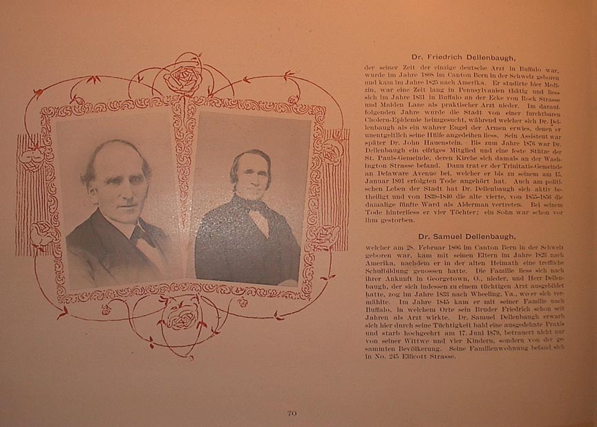 | . | Dr. Friedrich Dellenbaugh, who was in his day the only German physician in Buffalo, was born in 1808 in the Swiss Canton of Bern. He came to America in 1825. He studied medicine here, practiced for a while in Pennsylvania, and then came to Buffalo in 1831 and set up a practice here at the corner of Rock Street and Maiden Lane. In the years that followed there was a terrifying cholera epidemic, during which Dr. Dellenbaugh was a true guardian angel to the poor, to whom he extended his help. His assistant was later Dr. John Hauenstein. Until 1876 Dr. Dellenbaugh was an active member and ardent supporter of the St. Paul's Congregation, whose church at the time was located on Washington Street. Then he joined the Trinity Congregation on Delaware Avenue, to which he belonged until his death on January 15, 1891. Dr. Dellenbaugh took an active part in politics. From 1839 to 1840 he represented the old 4th Ward as Alderman. From 1855 to 1856 he was alderman to the 5th Ward. At his death he left behind 4 daughters. One son had died before him. Dr. Samuel Dellenbaugh, who was born on February 28, 1806 in the Swiss Canton of Bern, came with his parents to America in 1825, after receiving an excellent education in his old district. The family first settled in Georgetown, Ohio. Mr. Dellenbaugh, who educated himself to be a practicing physician, went to Wheeling, Va. in 1833 where he married. In 1845 he came with his family to Buffalo, where his brother Friedrich had been practicing as a physician for years. Dr. Samuel Dellenbaugh acquired a growing practice because of his ability. He died a highly respected man on June 17, 1879, mourned not only by his widow and 4 children but by the entire community. His family residence is located at 245 Ellicott Street.
