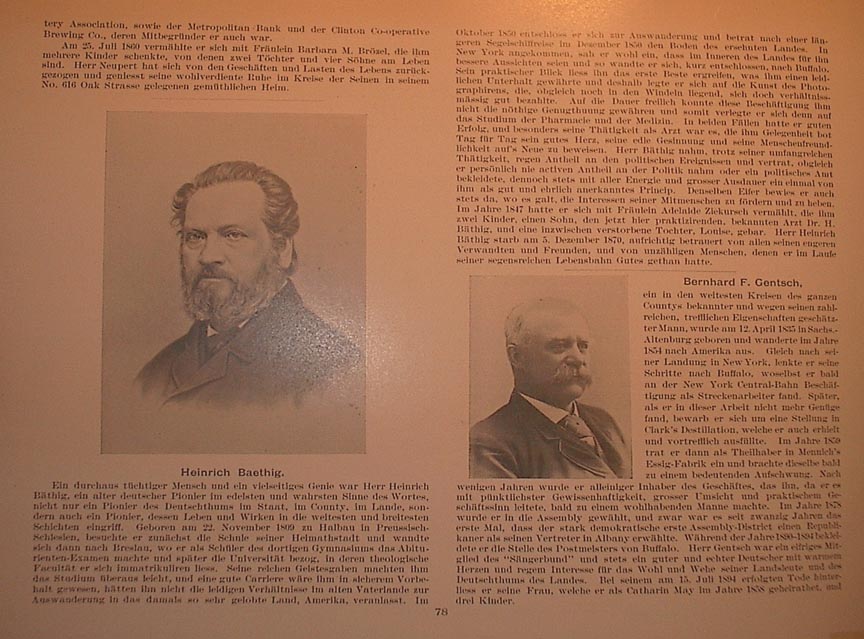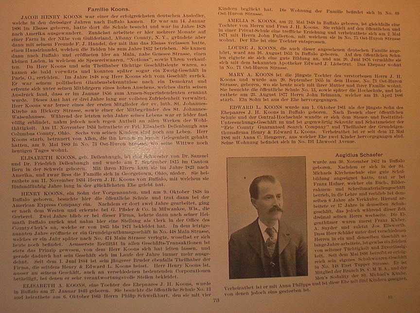 Elisabeth A. Koons, a daughter of Mr. & Mrs. J.H. Koons, was born in Buffalo on January 27, 1843. She attended Public School 13 and married Mr. Philip Schweikhart on October 6, 1863. She has blessed him with 4 children. The family residence is at 69 East Huron Street. Amelia S. Koons, born on May 22, 1848 in Buffalo, is also a daughter of Mr.and Mrs. J.H. Koons. She received an excellent education at the public school and through private schooling. She married Mr. John Fullerton on May 2, 1871. They live at 73 East Huron Street. There is one daughter from the marriage. Louise J. Koons, who also belongs to this highly respected family, was born on August 16, 1853 in Buffalo. She received a good education at the public schools and on June 20, 1876 she married the reknown apothecary, Edward J. Liebetrut. The couple lives at 71 East Huron Street. Mary A. Koons is the youngest daughter of the late Mr. J.H. Koons. She was born on September 20, 1855 at the house at 73 East Huron Street, where she lives today with her mother and her family. She attended Public School 13 and later the high school. On August 23, 1877 she married Mr. John Reimann, who died on April 19, 1886. One son came from the marriage. Edward L. Koons was born on October 1, 1861. He is the youngest son of Mr. and Mrs. J.H. Koons. After attending a public school and Central High School he entered the tax and title search business and is currently Secretary and Treasurer of the Erie County Guaranteed Search Company. On May 12, 1886 he married Anna C. Hengerer. Two children have resulted from the marriage. His residence is at 191 Linwood Avenue. Aegidius Schaefer was born on November 30, 1852 in Buffalo. After receiving a good education at St. Michael's Church School, he became an apprentice for Franz Hafner, who operated a book, picture frame and stationery business. He stayed there for 6 years as a saleman. After that he worked for 17 years in the same shoe business while at the same time the store changed owners 3 times. The owners were Franz Kleber, A. Snyder and lastly Jos. Ellsworth. The fact that Mr. Schaefer continued to work at the same business while it passed through 3 owners attests to his ability and perseverence. Since May 1896 he's been successful in his own shoewares business at 148 East Tupper Street. He is a member of Branch 18 of the C.M.B.A.,and a member of the Men's Sodality of St. Michael's Church. He is married to Anna Philipps. The marriage has been blessed by 5 children, of which one has died. * The term used is "Hausirhandel", which could mean peddling or hawking of pamphlets. This may have been a shop on a wagon or even a flea market type of establishment. Return to text