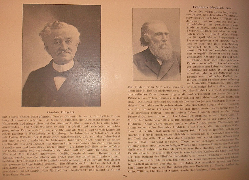 . | Gustav Glawatz, whose full name is Peter Heinrich Gustav Glawatz, was born on June 8, 1823 in Rotenburg (Hannover). He attended the elementary school in his father city and later went to the seminary in Stade to become a teacher. He specialized in music and after finishing his examinations he became employed as a music and speech teacher at an institute in Wandsbeck near Hamburg. In 1848 he married Louise Wilhelm, the widow of a landowner. He gave up teaching and became a farmer in Liebenau, Hannover. His wife gave him 3 daughters. After she died he emigrated to America in 1862 and came directly to Buffalo. In 1865 his daughters followed him to Buffalo. He married Miss Anna Delitsch. Five children came from this marriage - Cecilie, Bernhard, Anna, Hermann, and Emma. These children and his children from the first marriage all lived together in Buffalo. Since Mr. Glawatz settled here he has been successfully employed as a music teacher. He never held public office however he has been involved in the musical and social life of the city. He is a long time member of the Liedertafel. He lives at 498 West Utica Street. Frederick Hoddick, Sr.