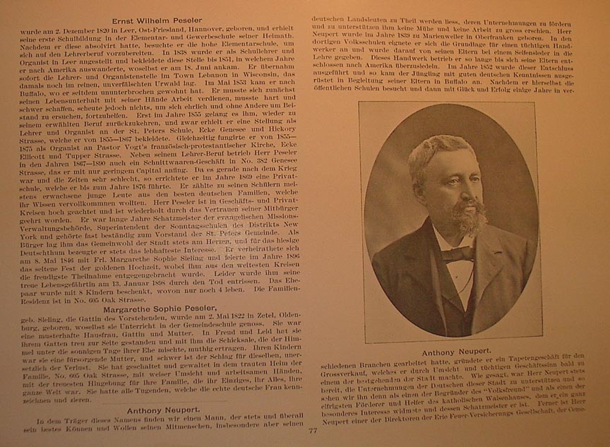 Margarethe Sophie Peseler, nee Sieling, wife of the above mentioned, was born on May 2, 1822 in Zetel, Oldenburg. She received her education at the parish school. She was a model homemaker, wife, and mother. In joy and in sadness she loyally remained at the side of her husband and courageously shared his fate, as mixed by the heavens amid the sunny days of their union. She was a caring mother for her children. Fate dealt her a heavy blow through them and caused her unbearable bereavement. She guided and presided over the cozy family home at 605 Oak Street with sage prudence and active hands, ever vigilent to the needs of her family, their concerns, their well being, their entire world. She was a woman of virtue, who recognized the role of the proper German wife and behaved accordingly. Anthony Neupert In the bearer of this name we find a man who gave the best of his abilities and intentions to help his fellow human beings, especially his German compatriots. No labor was too great and he spared no effort to foster and support their undertakings. Mr. Neupert was born in 1839 in Marienweiler, Upper Franken. In the local public school he secured the basic knowledge to become a capable tradesman. His parents then placed him as a apprentice to a soap maker. In 1852 the decision was made, thus the youngster, filled with fine German knowledge, came with his parents to Buffalo. He attended the public school here and through luck and skill working at various businesses managed to establish a wholesale carpet business. Circumspection and business sense made this one of the best-going concerns in the city. As we've already said, Mr. Neupert was always ready to support the endeavors of the German community, thus we see him become one of the founders of the Volksfreund [The People's Friend, a German newspaper], and we see him as a crusader and cofounder of the Catholic Orphanage, in which he had a special interest and for which he is Treasurer. Further Mr. Neupert is one of the directors of the Erie Fire Insurance Company, the Cemetery Association, the Metropolitan Bank and the Clinton Co-operative Brewing Co., of which he is a cofounder.