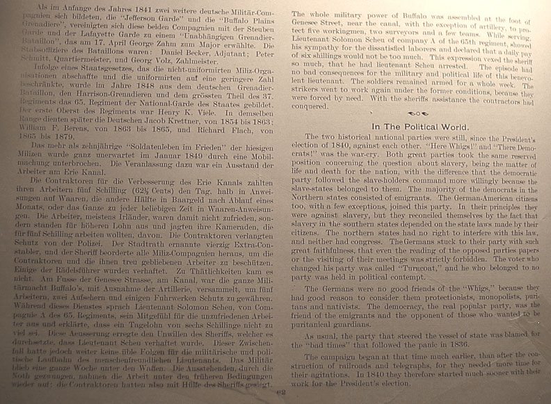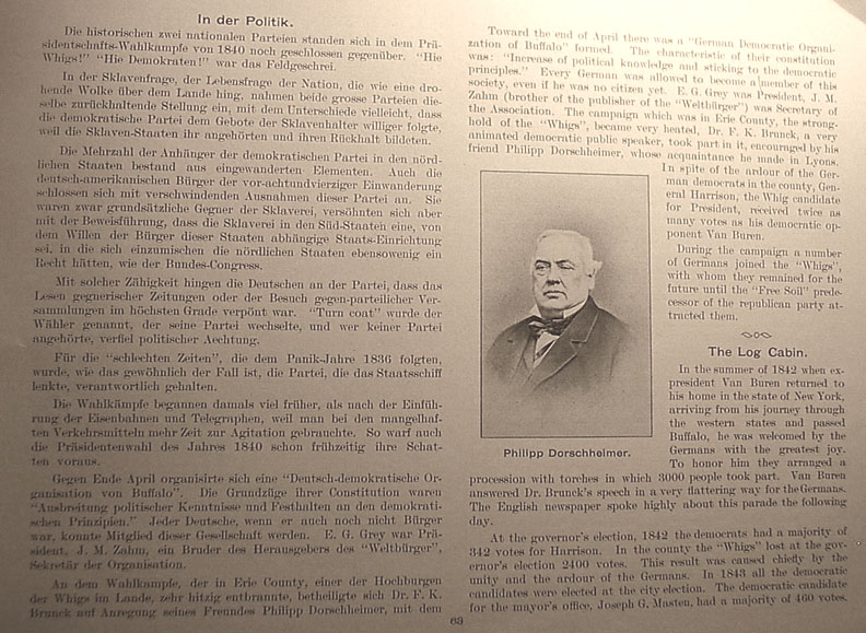 | . | Toward the end of April there was a "German Democratic Organization of Buffalo" formed. The characteristic of their constitution was: "Increase of political knowledge and sticking to the democratic principles." Every German was allowed to become a member of this society, even if he was no citizen yet. E.G. Grey was President, J.M. Zahm (brother of the publisher of the "Weltbürger") was Secretary of the Association. The campaign which was in Erie County, the stronghold of the "Whigs," became very heated, Dr. F.K. Brunck, a very animated democratic public speaker, took part in it, encouraged by his friend Philipp Dorschheimer, whose acquaintance he made in Lyons. In spite of the ardour of the German democrats in the county, General Harrison, the Whig candidate for President, received twice as many votes as his democratic opponent Van Buren. During the campaign a number of Germans joined the "Whigs", with whom they remained for the future until the "Free Soil" predecessor of the republican party attracted them. The Log Cabin In the summer of 1842 when ex-president Van Buren returned to his home in the state of New York, arriving from his journey through the western states and passed Buffalo, he was welcomed by the Germans with the greatest joy. To honor him they arranged a procession with torches in which 3,000 people took part. Van Buren answered Dr. Brunck's speech in a very flattering way for the Germans. The English newspaper spoke highly about this parade the following day. At the governor's election, 1842 the democrats had lost a majority of 342 votes for Harrison. In the county the "Whigs" lost at the governor's election 2400 votes. This result was caused by the unity and the ardour of the Germans. In 1843 all the democratic candidates were elected at the city election. The democratic candidate for the mayor's office, Joseph G. Masten had a majority of 460 votes. Caption under picture at right center reads Philipp Dorschheimer |