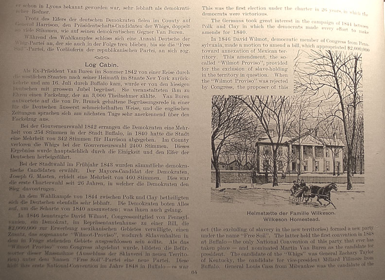 | . | This was the first election under the charter in 26 years, in which the democrats were victorious. The Germans took great interest in the campaign of 1844 between Polk and Clay in which the democrats made every effort to make amends for 1840. In 1846 David Wilmot, democratic member of Congress from Pennsylvania, made a motion to amend a bill, which appropriated $2,000,000 toward annexation of Mexican territory. This amendment, the so-called "Wilmot Proviso", provided for the exclusion of slave-holding in the territory in question. When the "Wilmot Proviso" was rejected by Congress, the proposer of this act (the excluding of slavery in the new territories) formed a new party under the name "Free Soil". The latter held the first convention in 1848 in Buffalo - the only National Convention of this party that ever has taken place - and nominated Martin Van Buren as the candidate for president. The candidate of the "Whigs" was General Zachery Taylor of Kentucky, the candidate for vice-president was Millard Fillmore from Buffalo. General Louis Cass from Milwaukee was the candidate of the Caption under picture at right center readsWilkeson Homestead