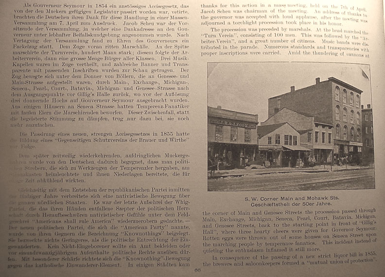 thanks for this action in a mass meeting held on the 7th of April. Jacob Scheu was chairman of the meeting. An address of thanks to the governor was accepted with loud applause, after the meeting was adjourned a torchlight procession took place in his honor. The procession was preceded by marshals. At the head marched the "Turn Verein" [Gymnastics Club], consisting of 100 men. This was followed by the "Arbeiter Verein" [Workmen's Association], and a great number of citizens. Music bands were distributed in the parade.[1.] Numerous standards and transparencies with proper inscriptions were carried. Amid the thundering of cannons at the corner of Main and Genesee Streets the procession passed through Main, Exchange, Michigan, Seneca, Pearl, Court, Batavia, Michigan, and Genesee Streets, backing to the starting point in front of "Gillig's Hall", where three hearty cheers were given for Governor Seymour. Rotten eggs were thrown out of some houses on Seneca Street upon the marching people by temperance fanatics. This incident instead of quieting the enthusiasm inflamed it still more. In consequence of the passing of a new strict liquor bill in 1855, the brewers and saloonkeepers formed a "mutual union of protection". Caption under picture at right center reads S.W. Corner of Main and Mohawk Streets , Business District of the 1850s [1.]The German text reads "There were three music bands in the parade and numerous banners and transparencies with appropriate sayings were carried." Return to text Return to Indexes Go on to Pages 67 - 71
